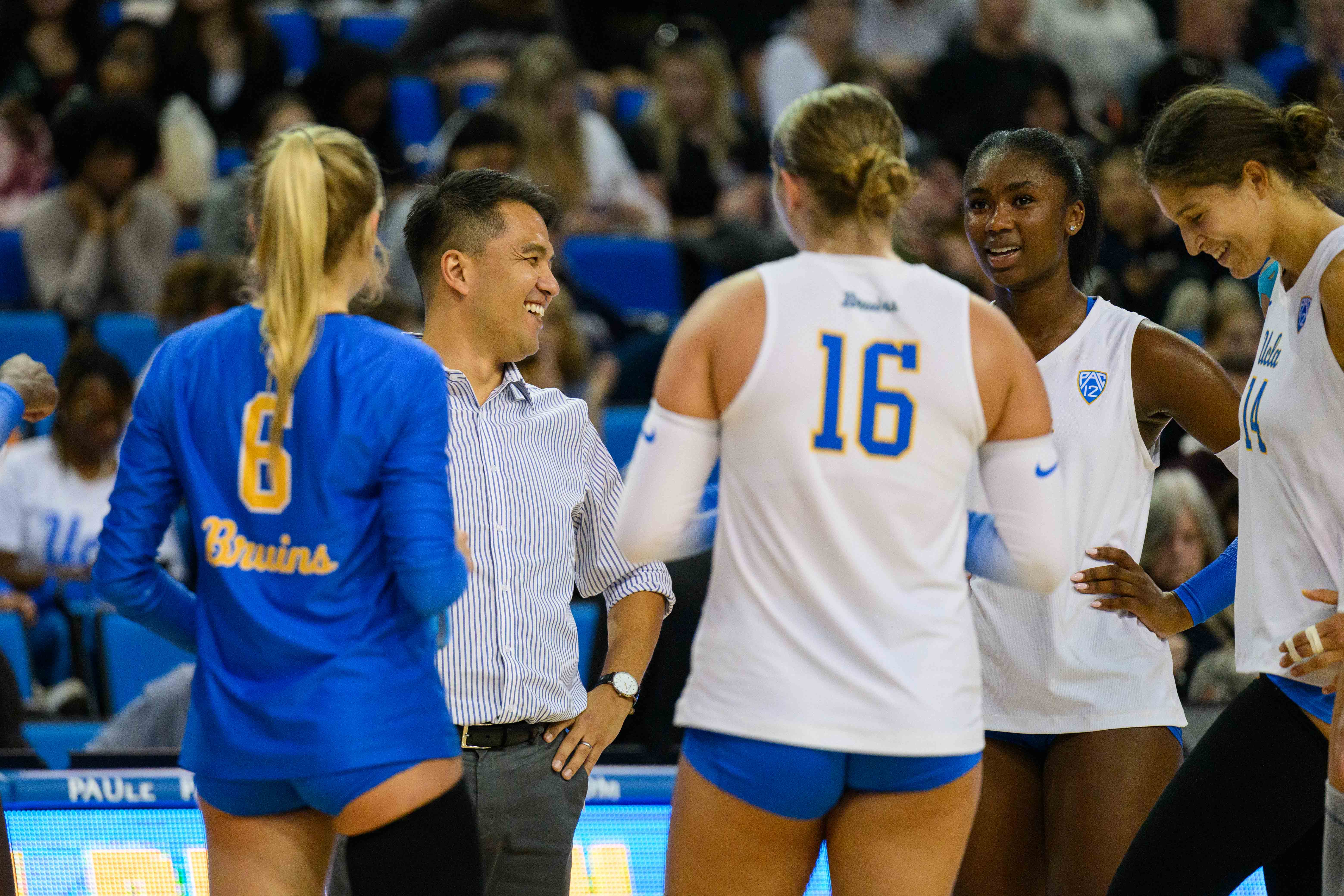 Members of the UCLA women’s volleyball team speak to Alfee Reft during his first year as the head coach. (Daily Bruin file photo)