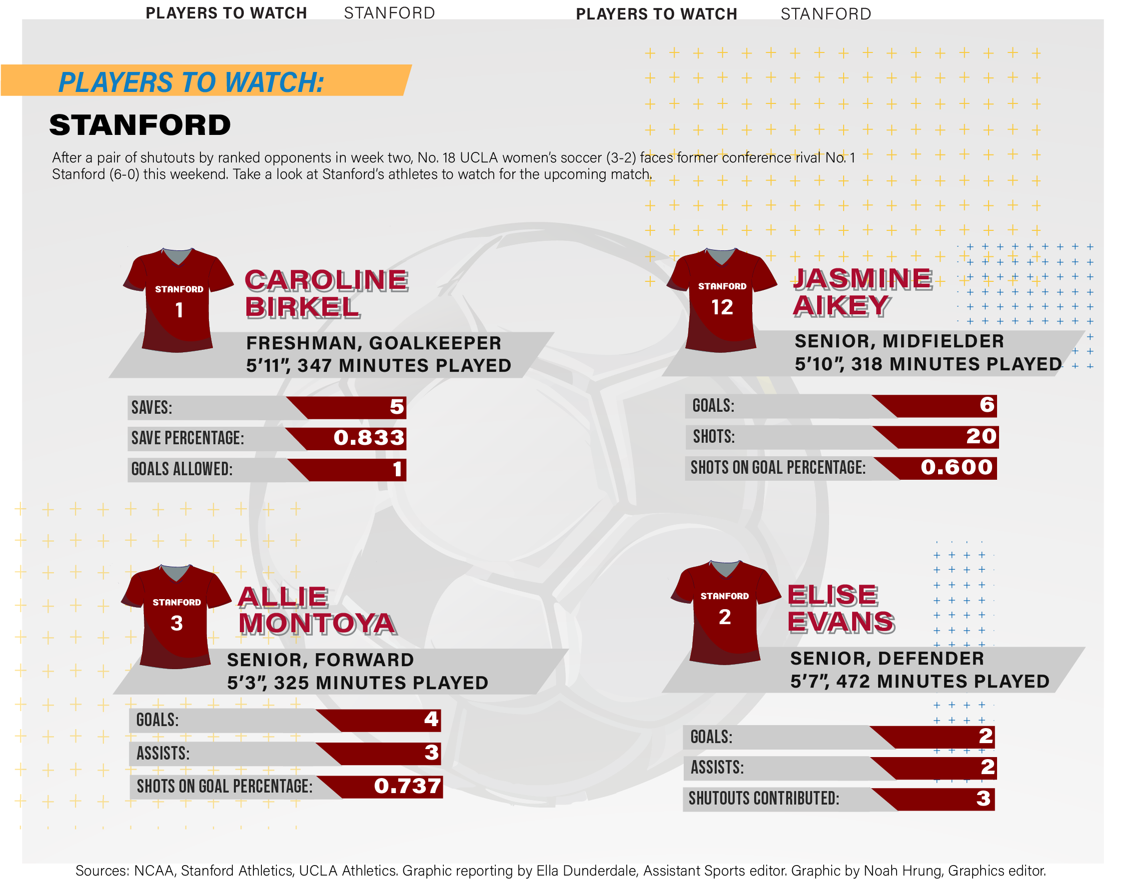 Stanford’s consistency – particularly in players like midfielder Jasmine Aikey, who has put up two multigoal games, and forward Allie Montoya, who boasts 14 shots on goal and a .737 shot on goal percentage – could pose challenges for UCLA, a relatively young team that is yet to find any standout scorers.
