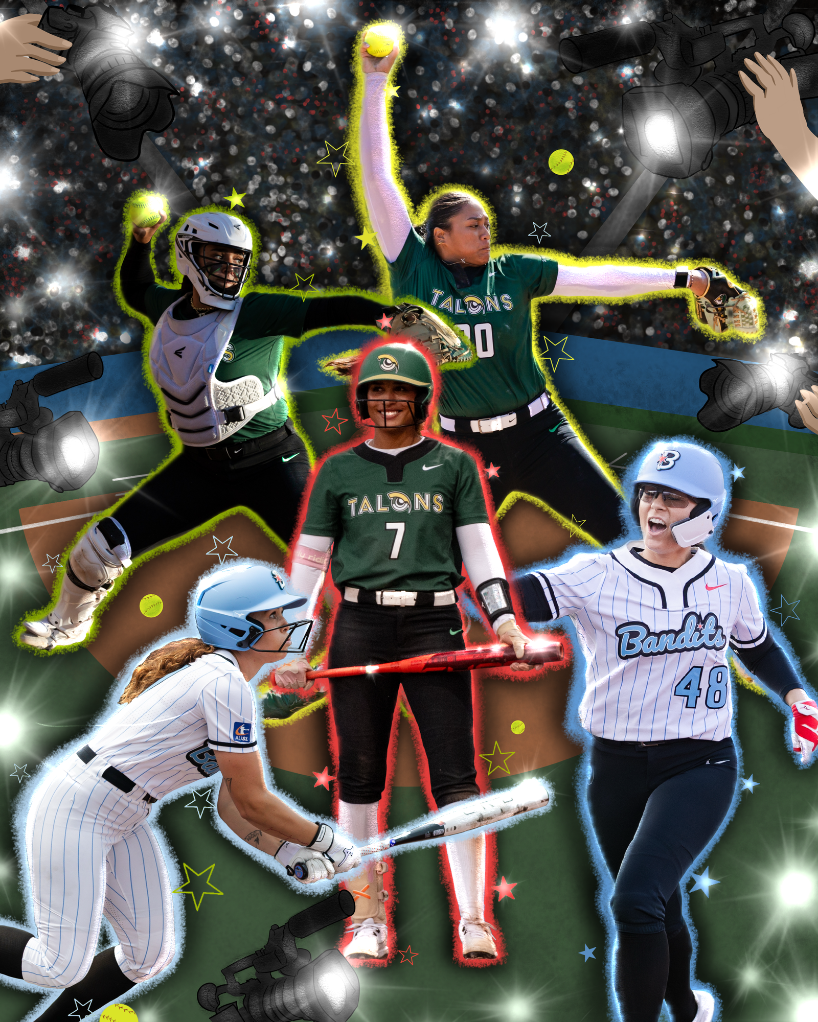 AUSL athletes and UCLA alumnae Delanie Wisz, Sharlize Palacios, Maya Brady, Megan Faraimo and Bubba Nickles-Camarena stand on a softball diamond, surrounded by flashing cameras. Eight former Bruin players contributed to the AUSL’s inaugural season in 2025, and four hoisted the championship trophy. (Photos Courtesy of Athletes Unlimited Softball League. Photo Illustration by Desiree Gonzalez/Daily Bruin staff)