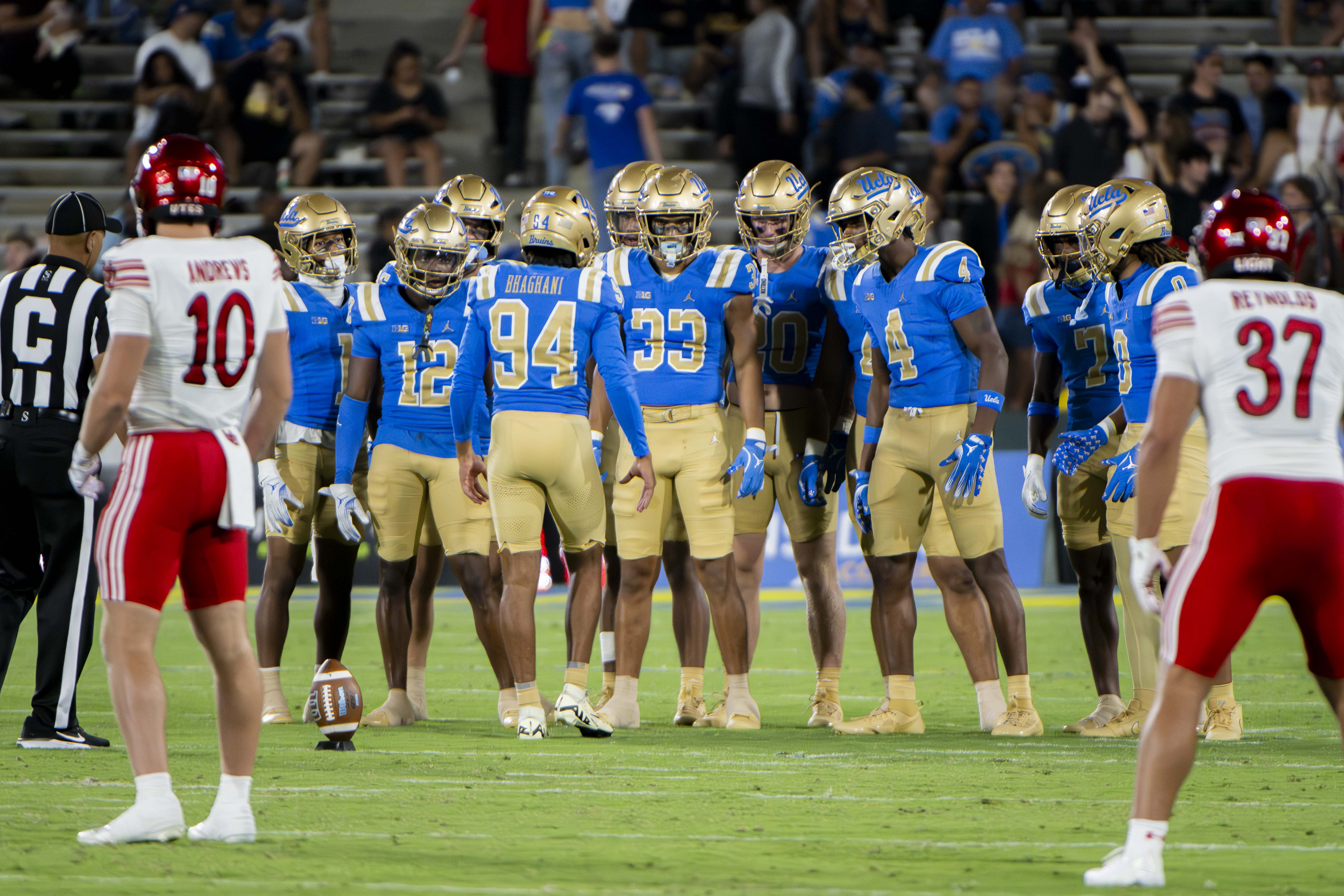 UCLA football special teams huddle together before a kickoff. (Andrew Ramiro Diaz/Photo editor)