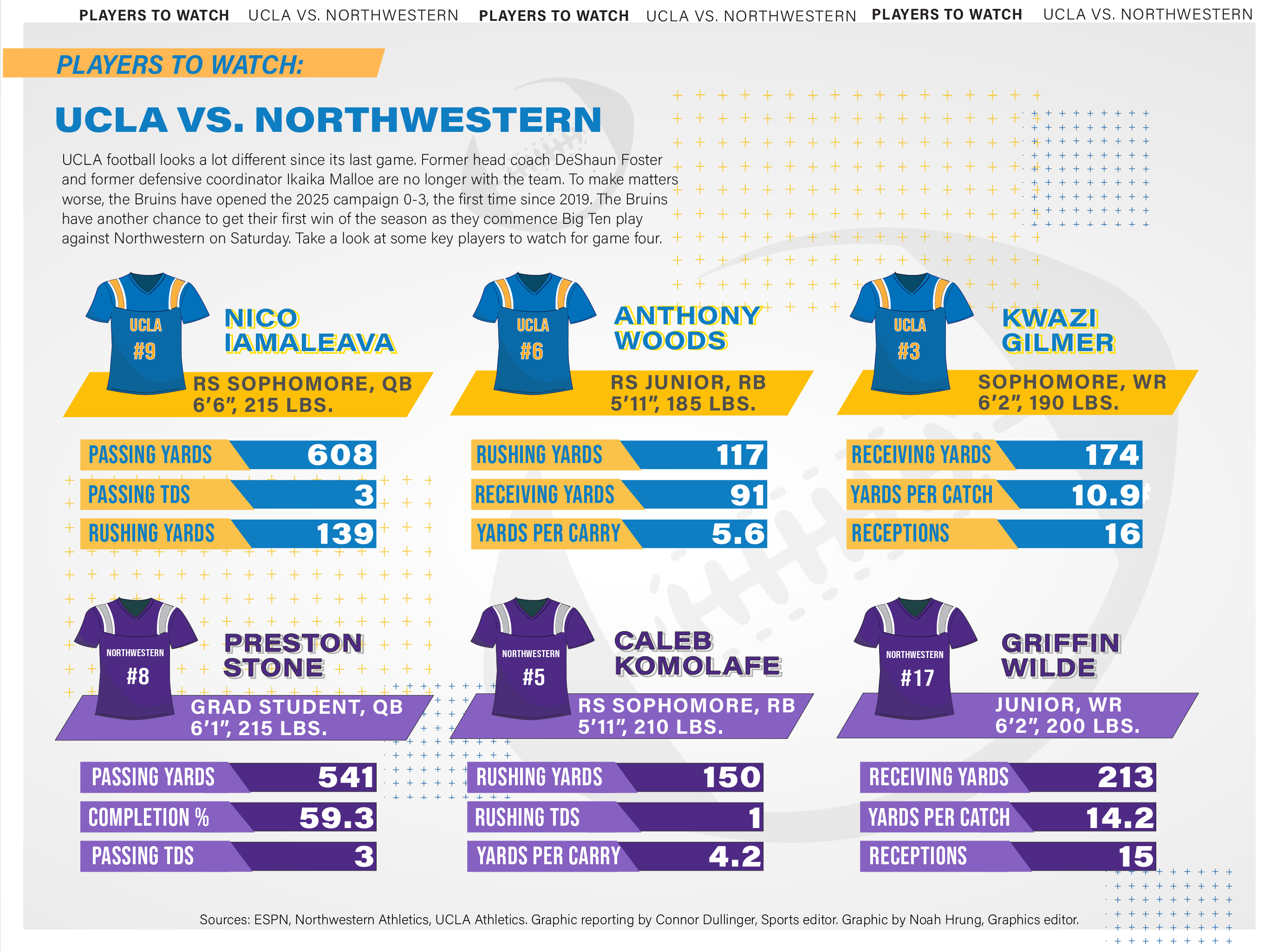 UCLA football (0-3) could not look more different since its last game. Former head coach DeShaun Foster and defensive coordinator Ikaika Malloe are gone, and interim head coach Tim Skipper and defensive analyst Kevin Coyle are in. UCLA could earn its first win of the season in its first conference game of the season against Northwestern (1-2, 0-1 Big Ten) at Martin Stadium in Evanston. Here are UCLA’s week five predictions from Sports editor Connor Dullinger and senior staffer Kai Dizon – along with a guest prediction from Managing Editor Shiv Patel.