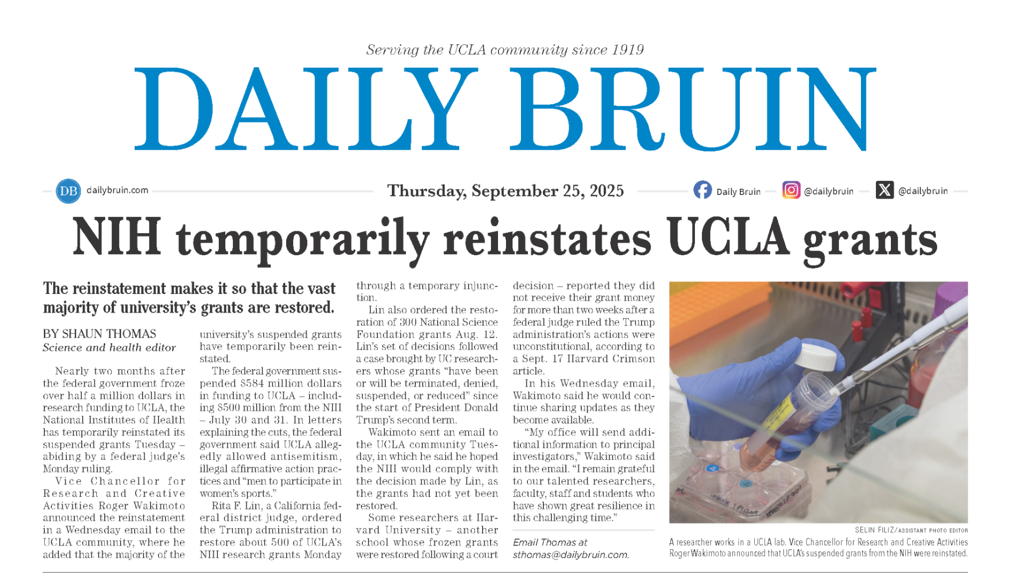 The Daily Bruin publishes print issues every Monday, Wednesday and Friday during the school year. You can view the online version of The Bruin here.