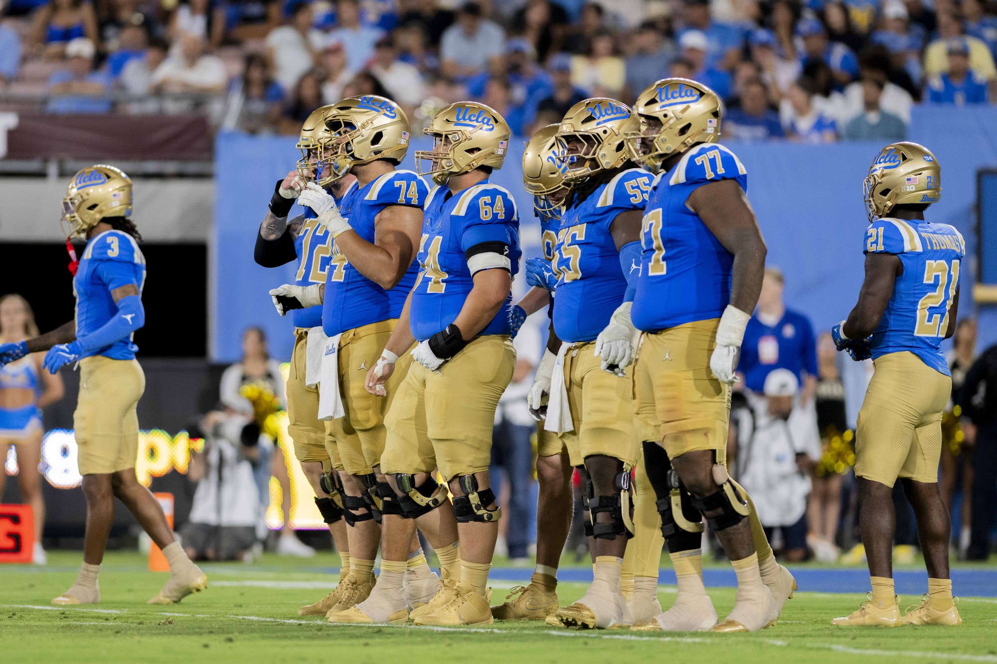 UCLA football prepares to get ready for the snap. (Aidan Sun/Assistant Photo editor)