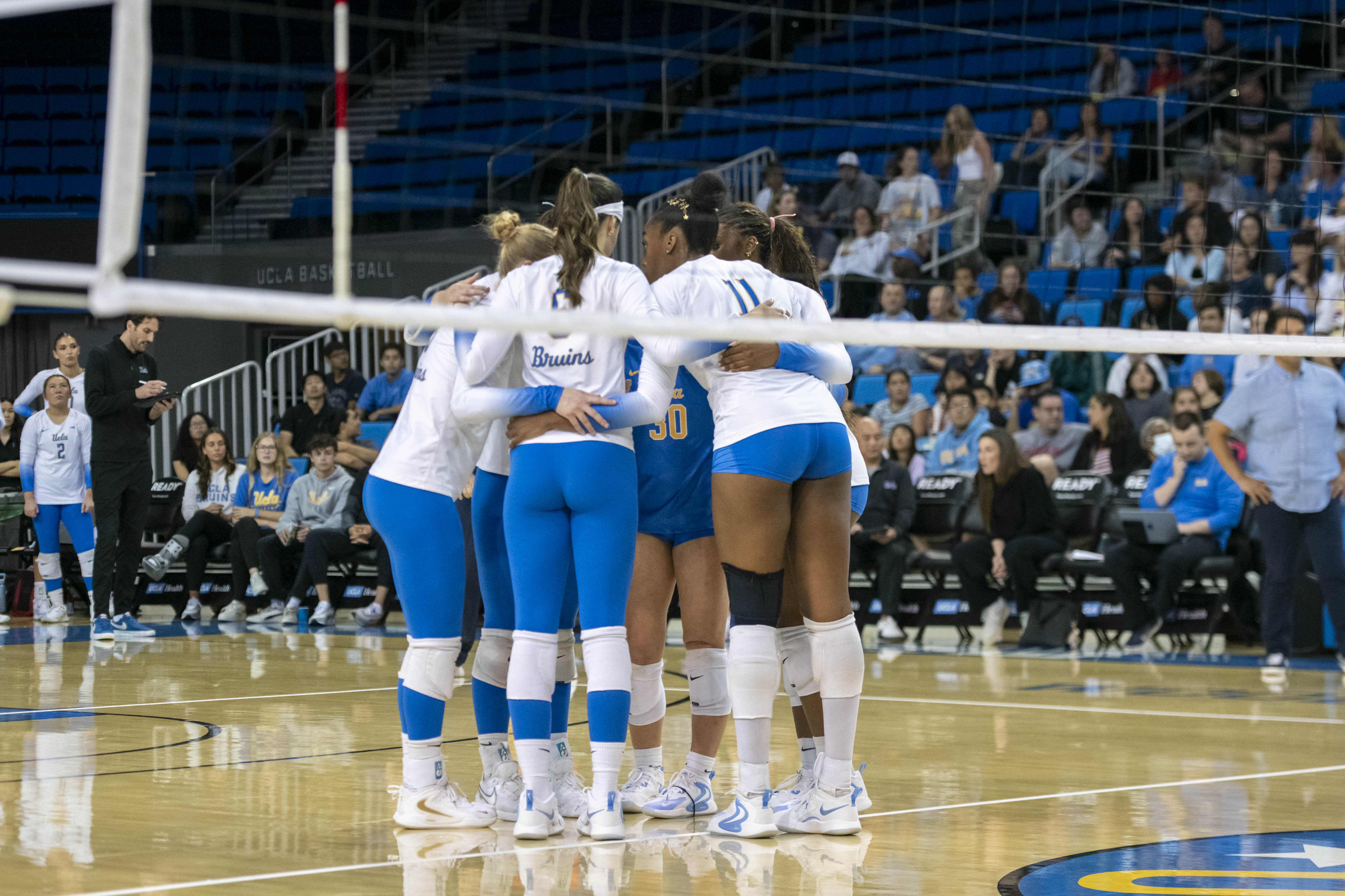Members of UCLA women’s volleyball gather in a circle. The Bruins fell in their first two home contests of the season this week. (Leydi Cris Cobo Cordon/Daily Bruin senior staff)