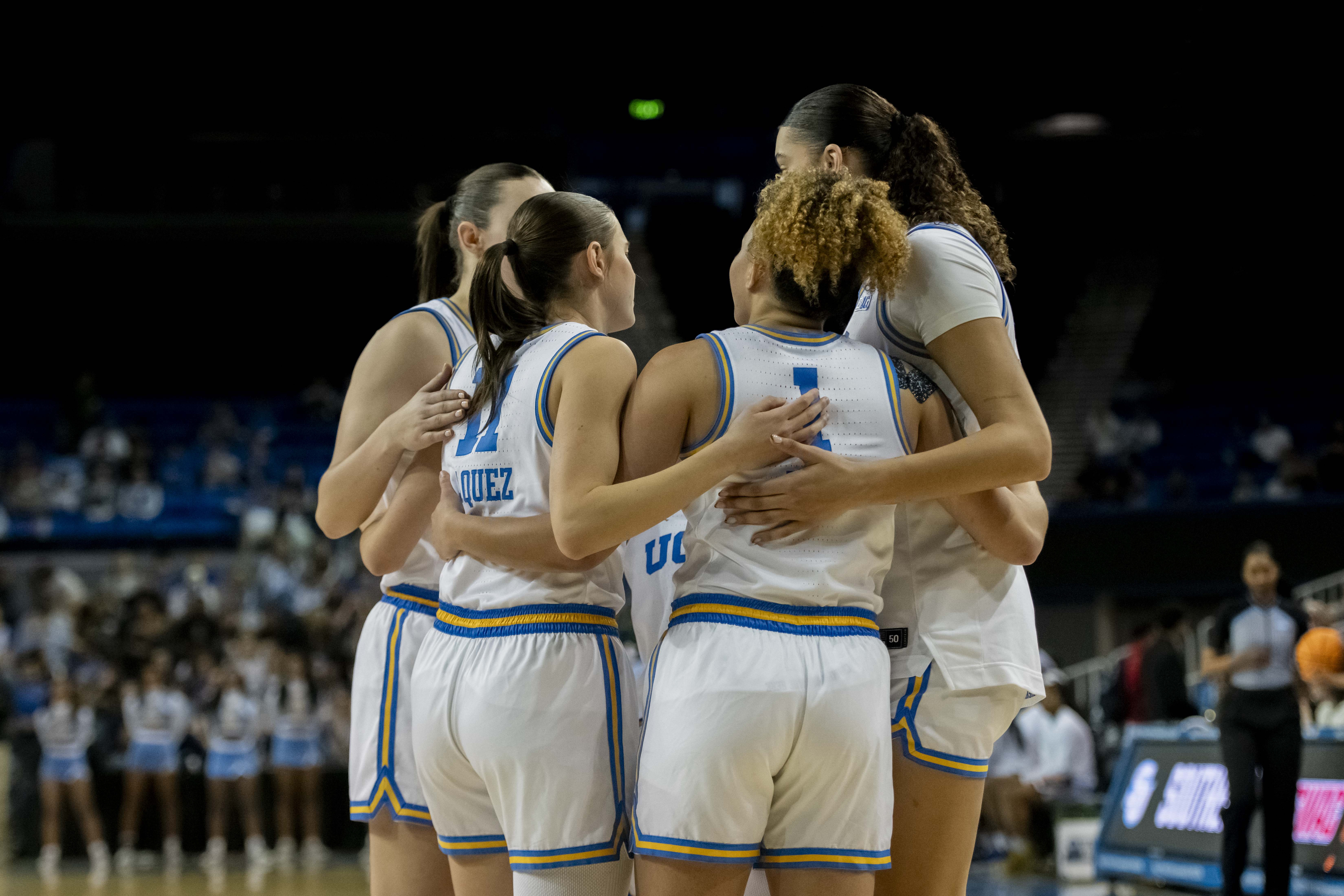 UCLA women’s basketball huddles up on the court at Pauley Pavilion. (Andrew Ramiro Diaz/Photo editor)