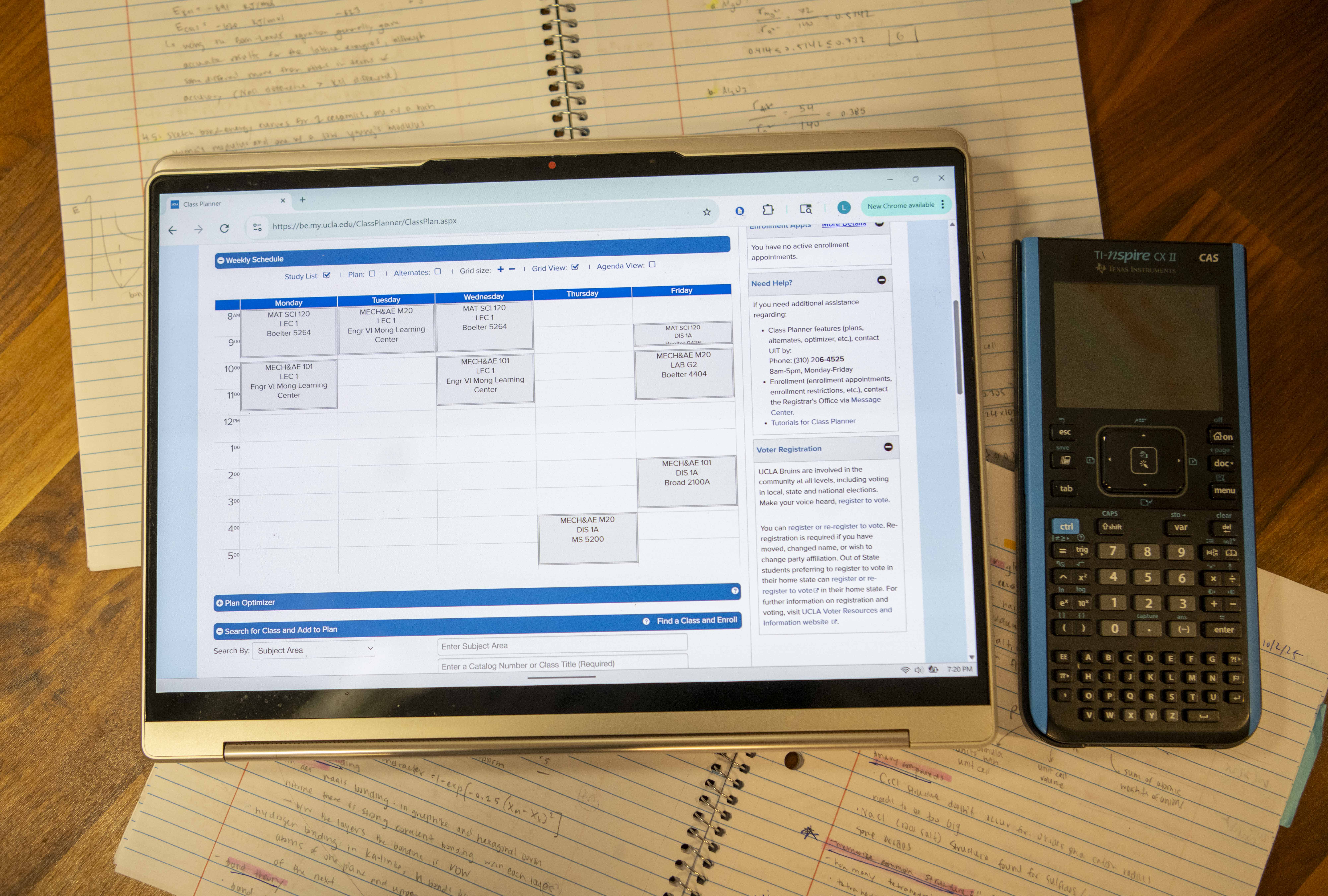 A MyUCLA class planner with STEM classes is pictured. BruinBot, which was developed through a UCLA Digital Technology program with OpenAI’s enterprise platform, helps students generate tailored class schedules by analyzing their degree requirements and preferences. (Leydi Cris Cobo Cordon/Daily Bruin senior staff)