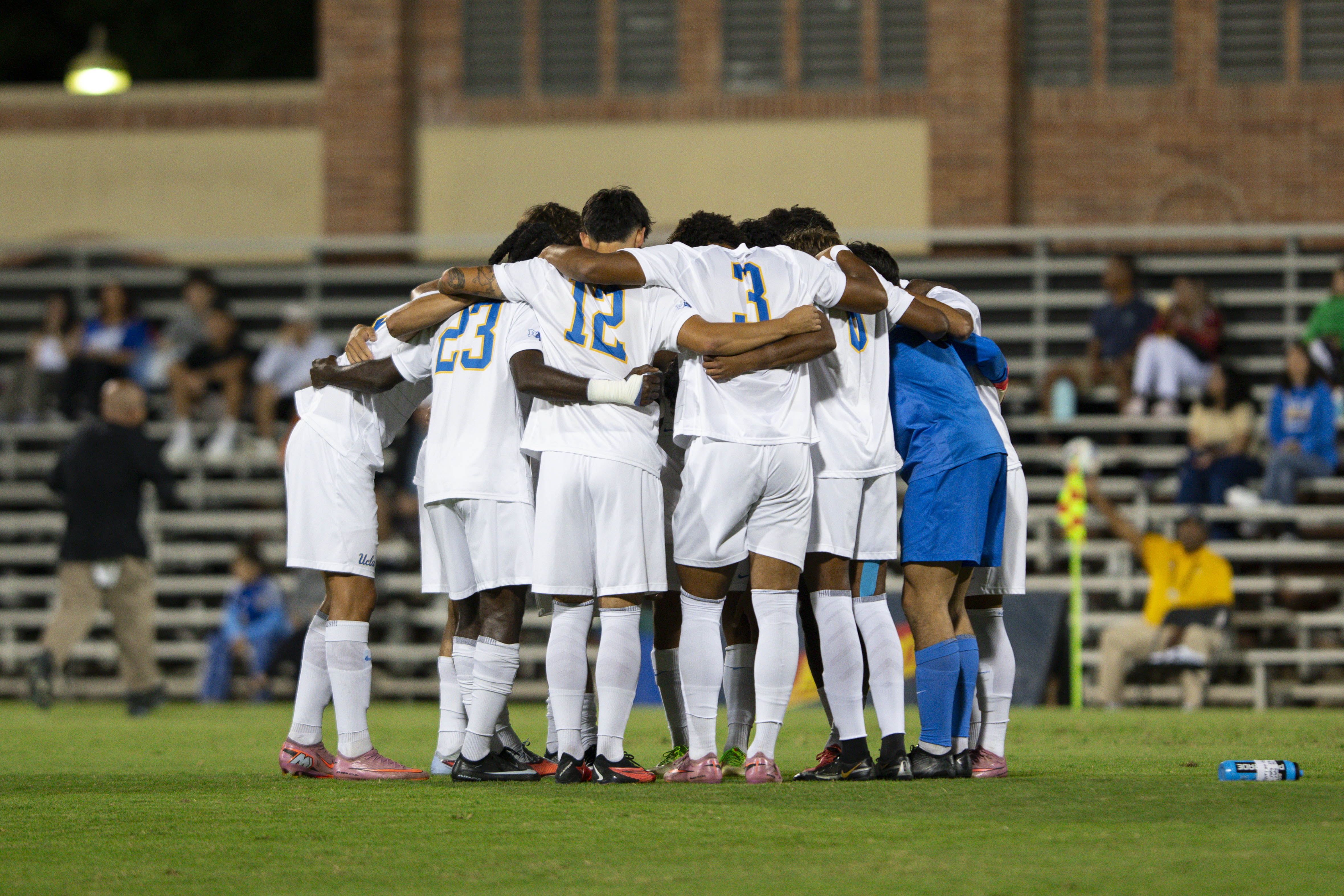 UCLA men’s soccer huddles on the field at Wallis Annenberg Stadium. (Libby Li/Daily Bruin)