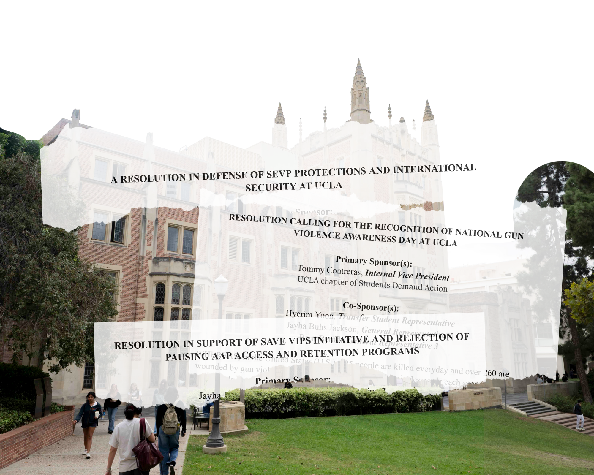 Snippets from resolutions passed by the Undergraduate Students Association Council over the summer are layered over a picture of Kerckhoff Hall. USAC passed six resolutions over the summer, some in collaboration with student groups. (Photo by Crystal Tompkins/Daily Bruin senior staff. Design by Karina Aronson/Assistant Design director)