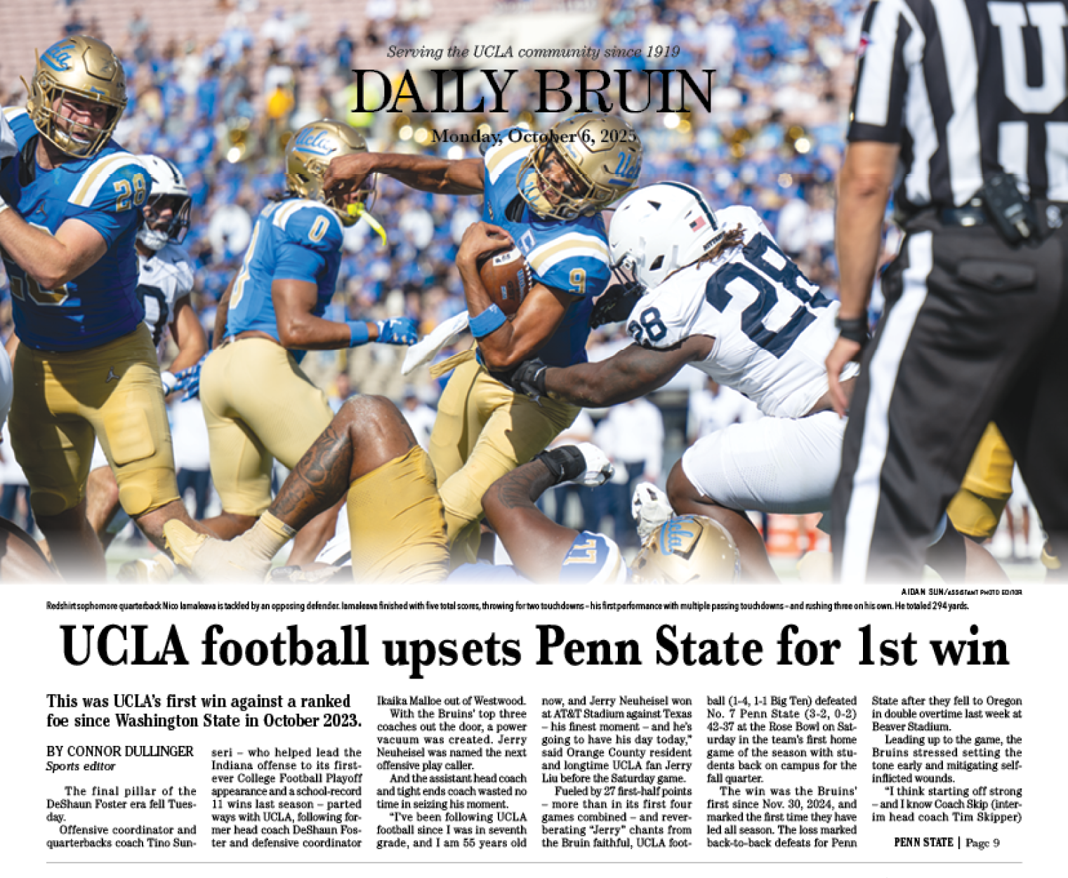 The Daily Bruin publishes print issues every Monday, Wednesday and Friday during the school year. You can view the online version of The Bruin here.