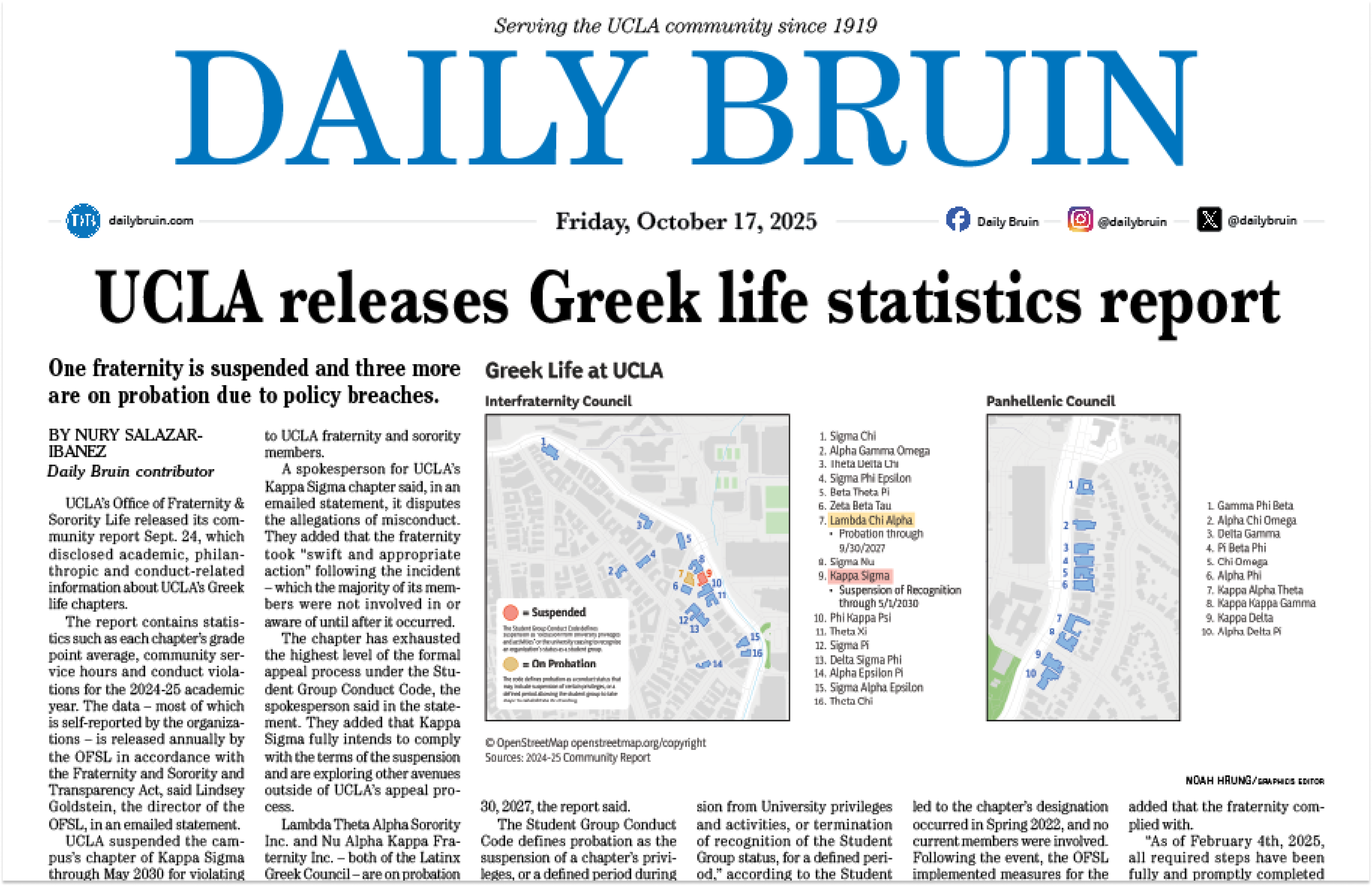 The Daily Bruin publishes print issues every Monday, Wednesday and Friday during the school year. You can view the online version of The Bruin here.