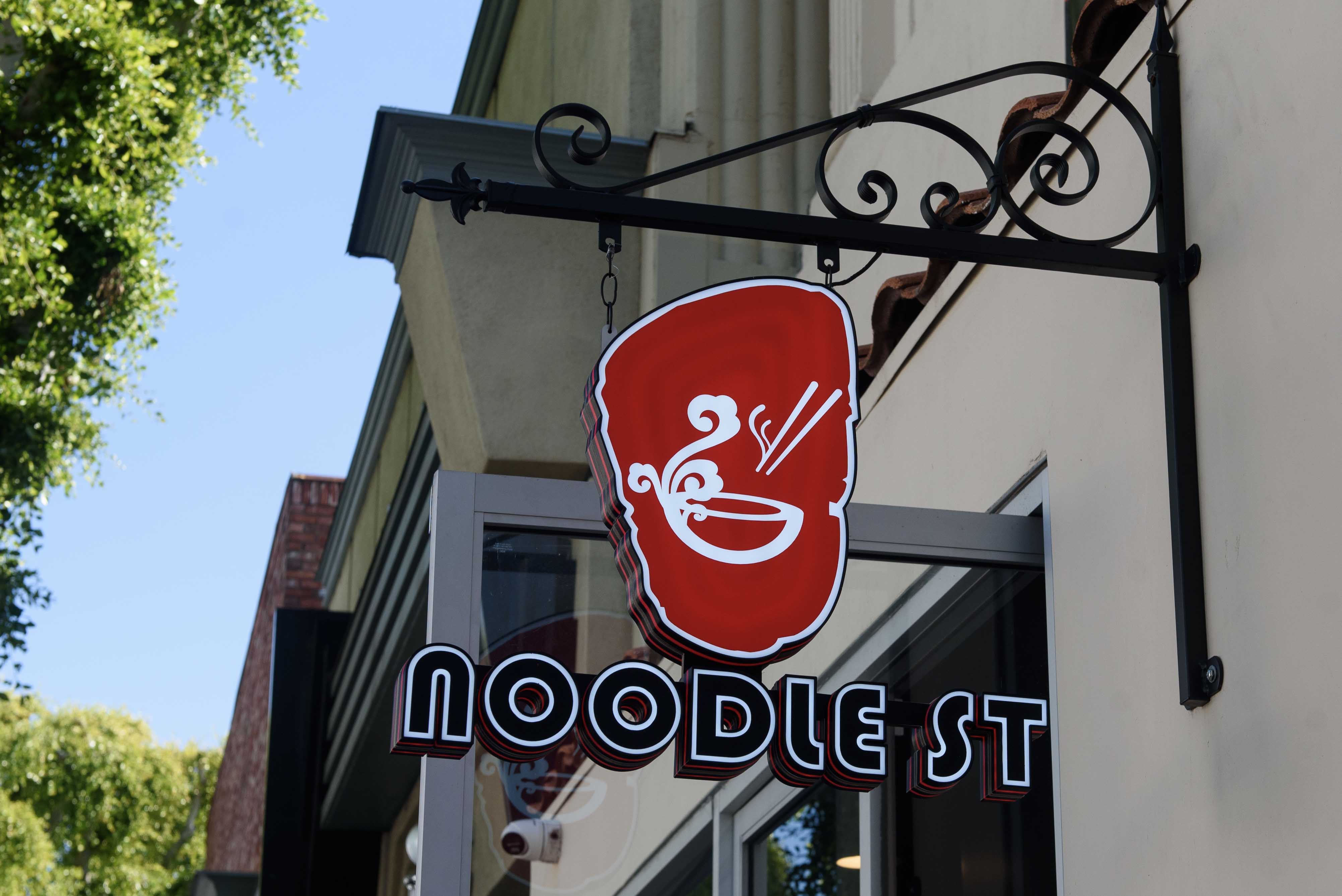 The Noodle St. sign hands outside the restaurant. The chain opened up its Westwood location earlier this year on Weyburn Avenue and features a variety of noodle-based dishes. (Leydi Cris Cobo Cordon/Daily Bruin senior staff)