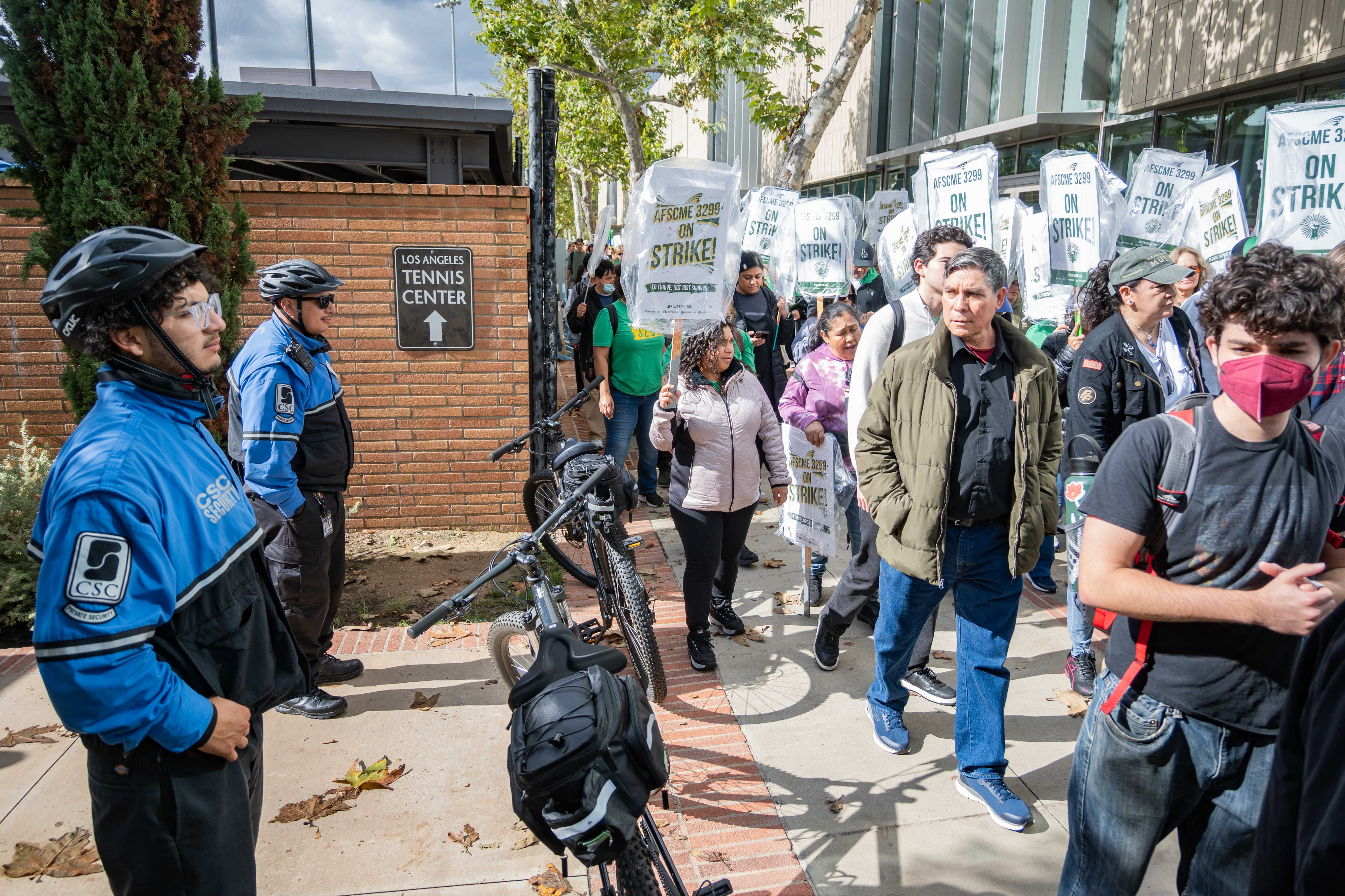 The protesters chanted alongside a second group of AFSCME Local 3299 demonstrators that marched up to Gateway Plaza from Westwood Boulevard at 1:35 p.m. Separate groups of people rallied around multiple sides of the Luskin Conference Center around 1:45 p.m., chanting, “No contract, no peace!”