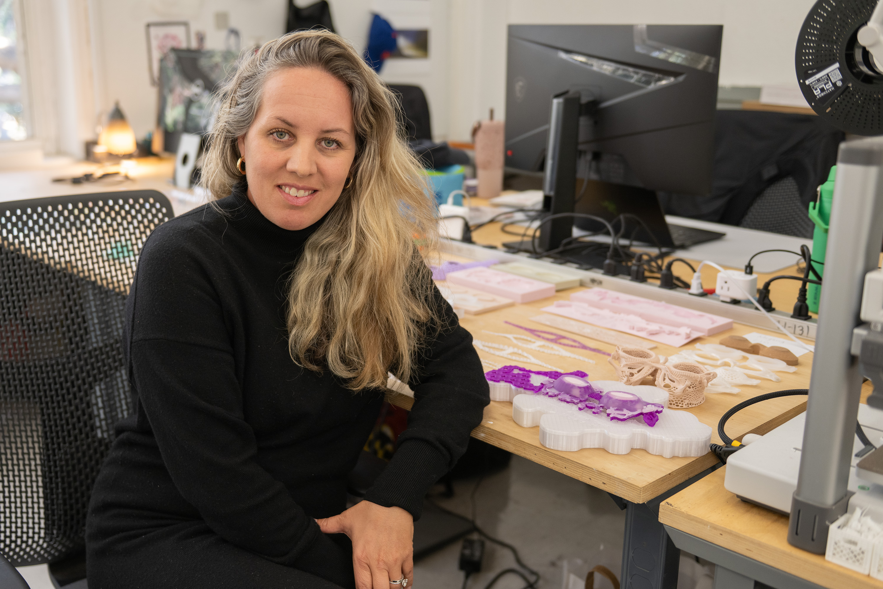 Julia Koerner, an associate adjunct professor in UCLA Architecture and Urban Design, sits in her lab. Koerner works on 3D printing design techniques in the creation of sustainable architecture, fashion and other products. (Joice Ngo/Daily Bruin)