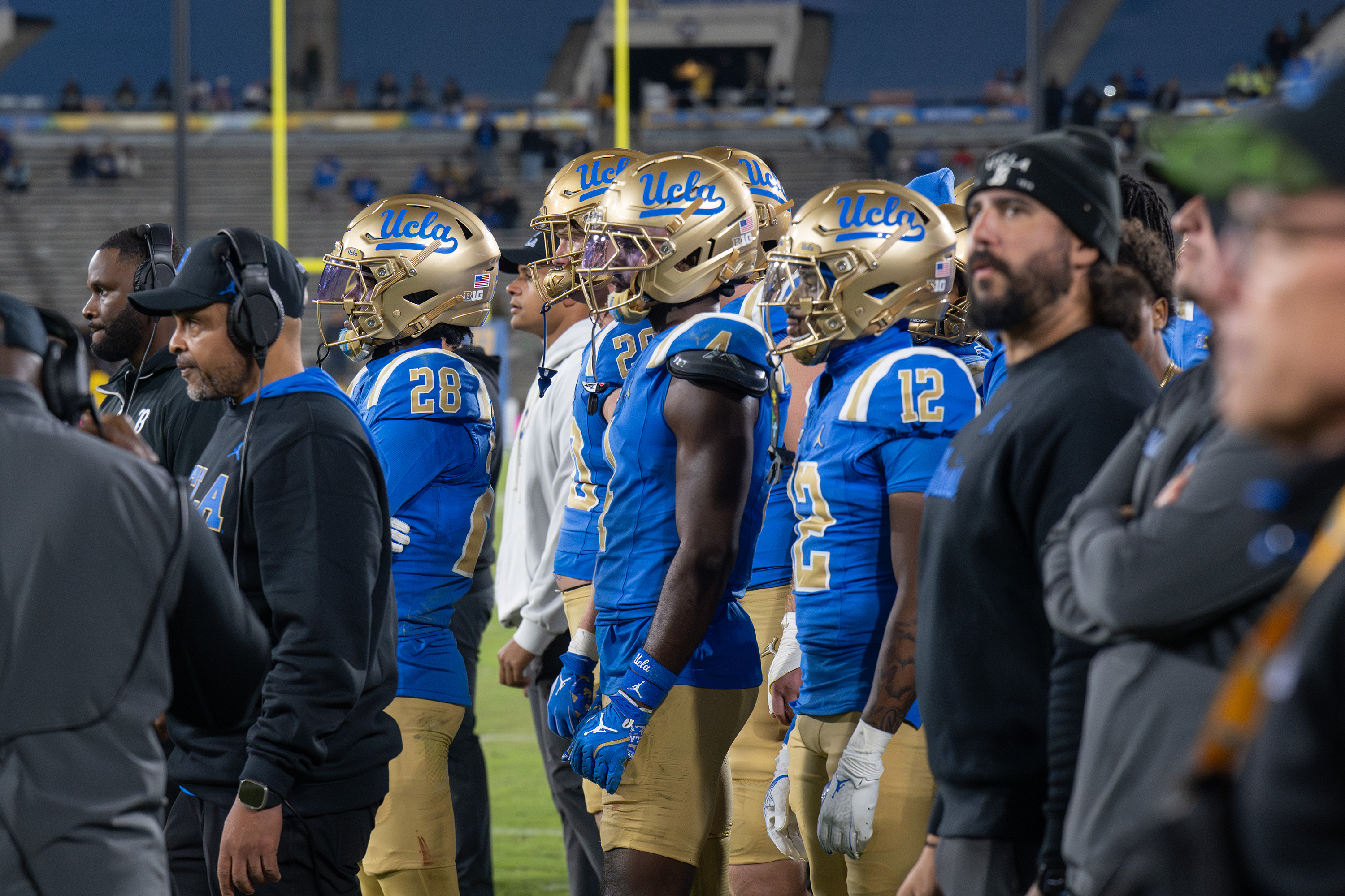 UCLA football players stand on the sideline at the Rose Bowl and watch. (Michael Gallagher/Assistant Photo editor)