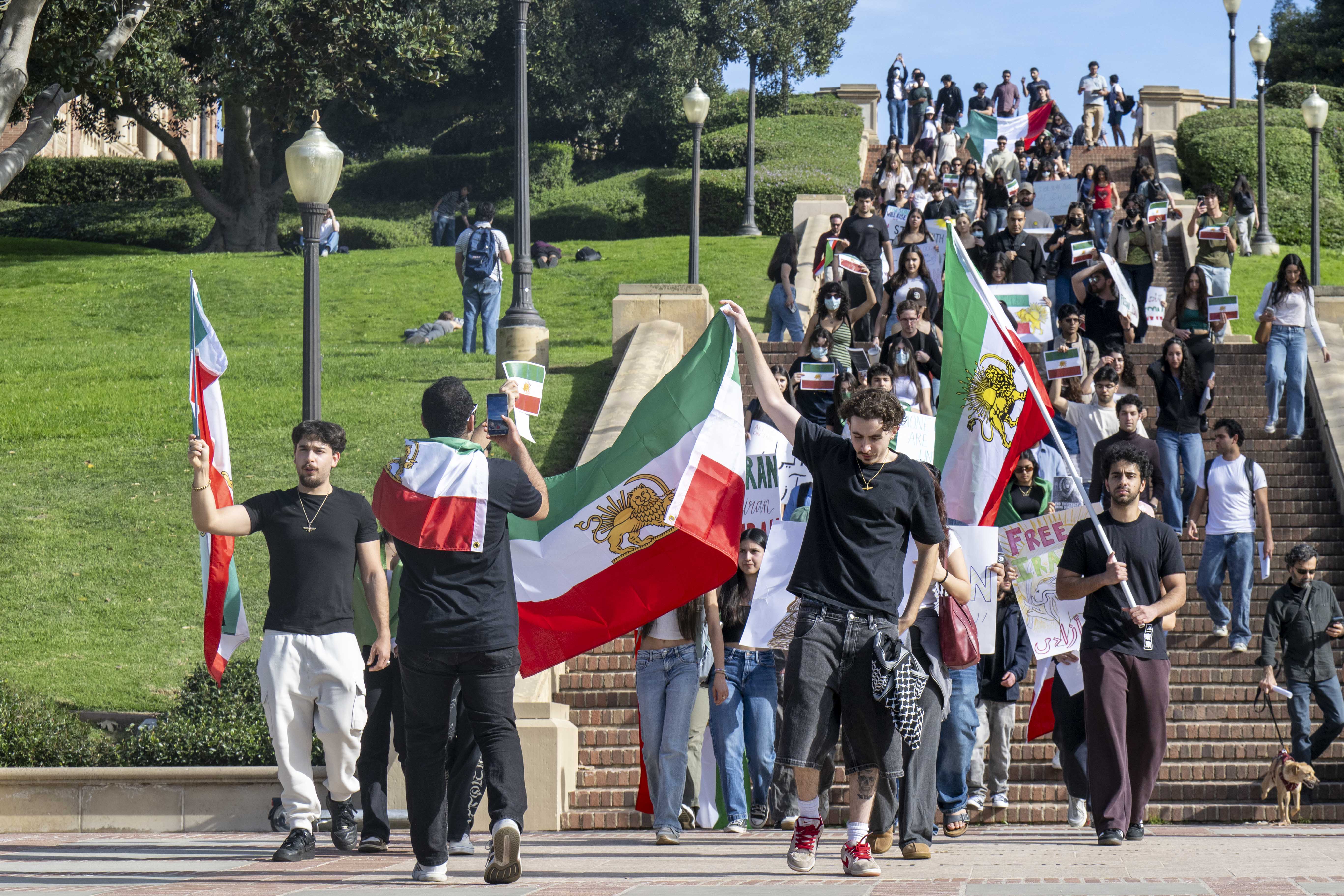 Demonstrators calling for regime change in Iran walk down Janss steps. The rally, which began at around 12:20 p.m. in Bruin Plaza, was held by the Iranian Student Group at UCLA. (Leydi Cris Cobo Cordon/Daily Bruin senior staff)