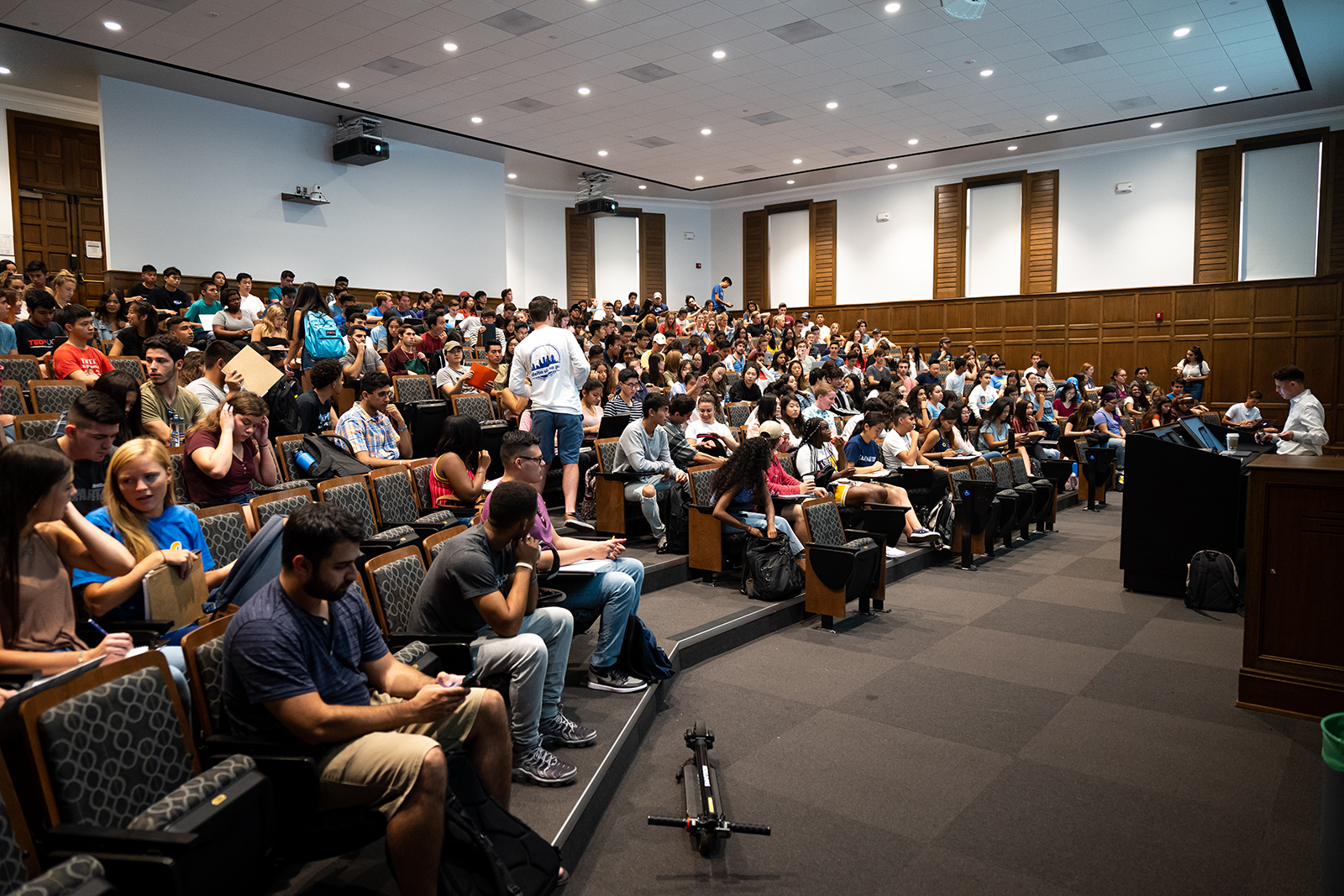 A crowded lecture hall is pictured. Columnist Mia Kennedy argues grades should not be central to the learning process. (Daily Bruin file photo)