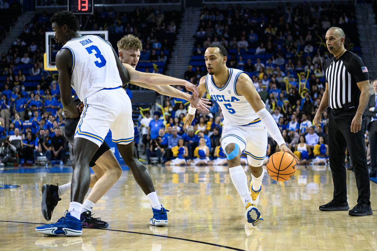 Former Bruin guard Amari Bailey dribbles toward the arc at Pauley Pavilion. (Daily Bruin file photo)