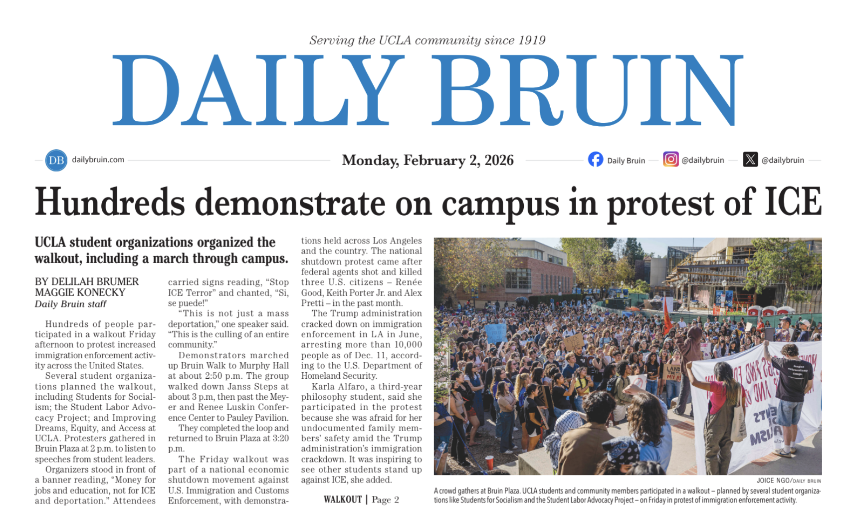 The Daily Bruin publishes print issues every Monday, Wednesday and Friday during the school year. You can view the online version of The Bruin here.