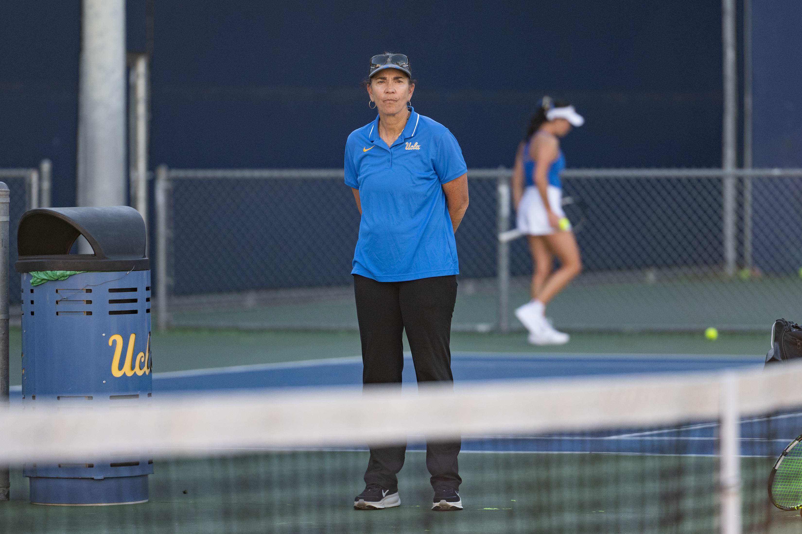 Coach Stella Sampras Webster stands on the courts at the Los Angeles Tennis Center. Sampras Webster is in her 30th season as head coach of the Bruins. (Brianna Carlson/Daily Bruin staff)