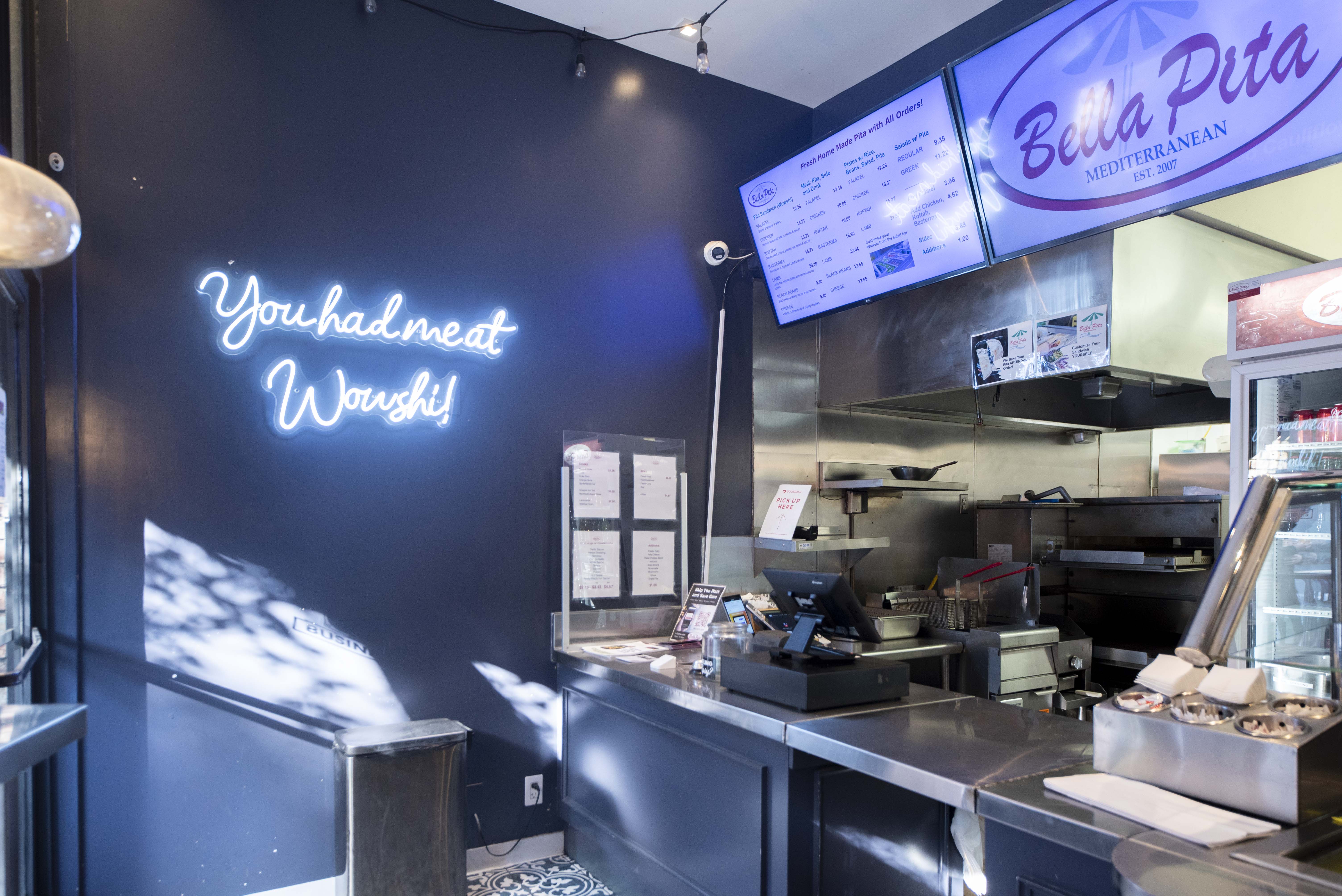 The inside of Bella Pita is pictured, with a cash register at the ordering table, two televisions hanging above and an LED sign on the wall. Founder Medy Sanadidi, a retired UCLA adjunct professor, said the restaurant began as a father-son project. (Joice Ngo/Daily Bruin)