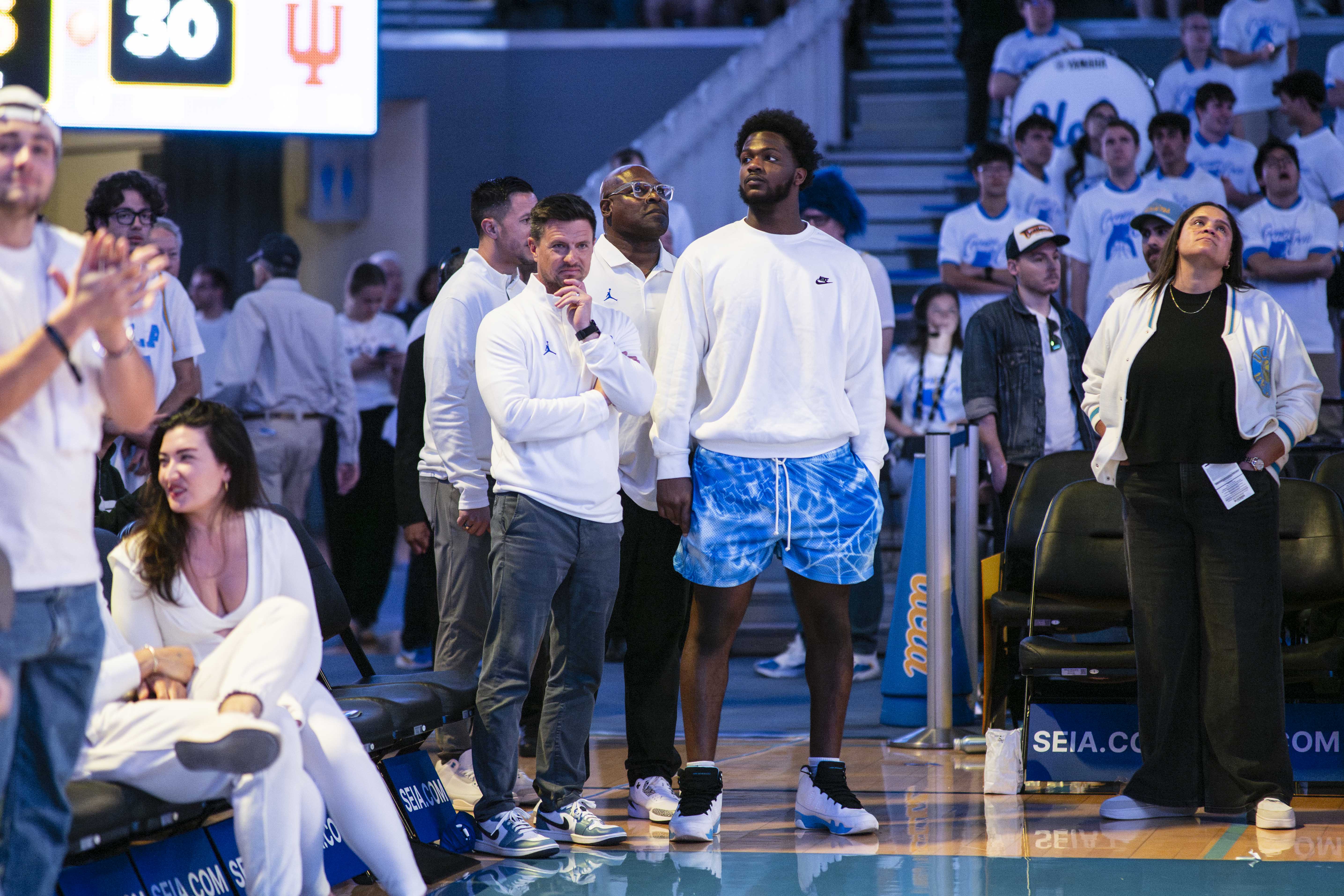 UCLA football coach Bob Chensey (left) and new UCLA defensive linemen Sahir West (right) stand on the sideline at Pauley Pavilion. (Aidan Sun/Assistant Photo editor)
