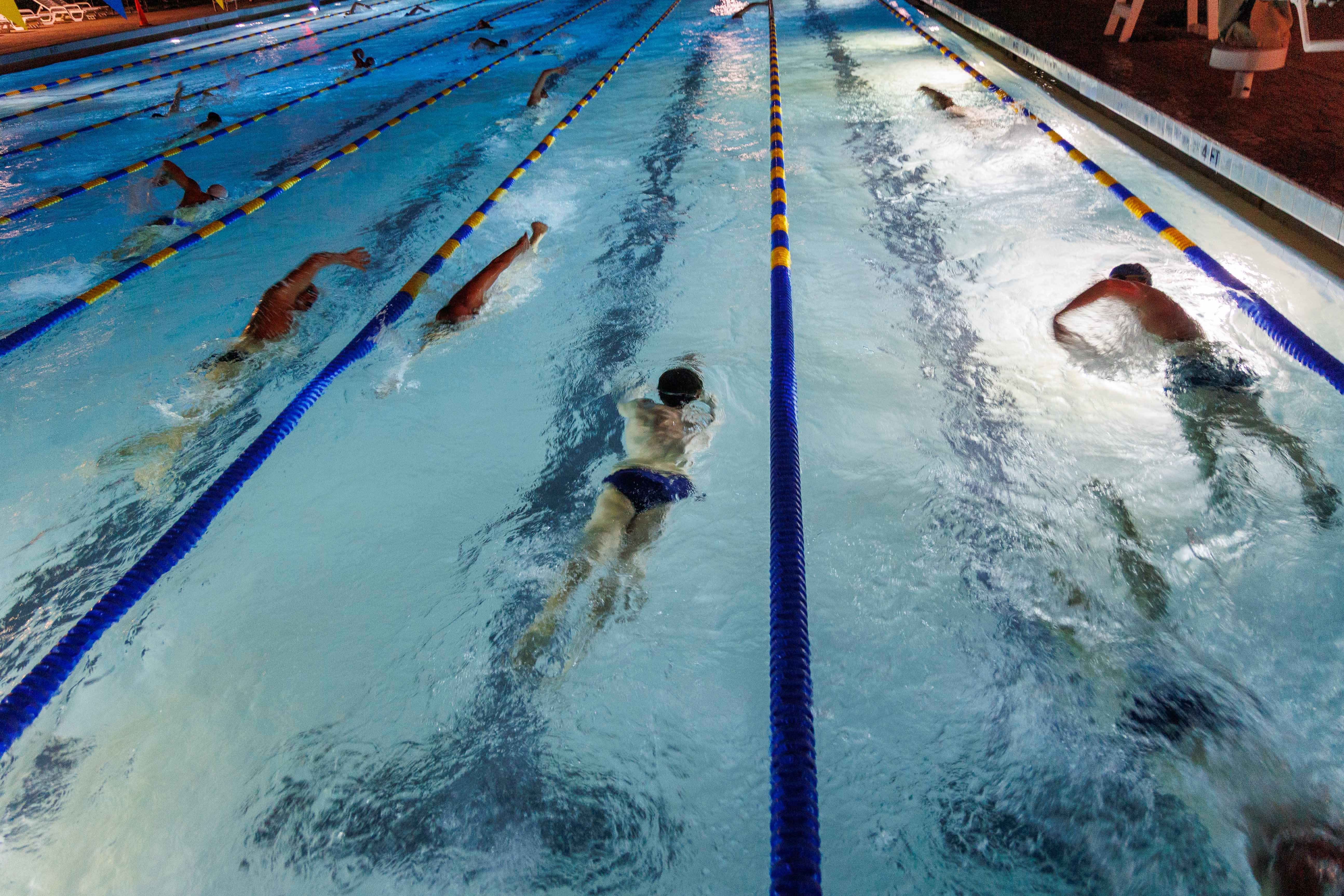 Members of the Bruin Masters Swim Club — a UCLA Recreation program for adult faculty, staff and students — swim at the Sunset Canyon Recreation Center. The swim club, which was founded in 1995, includes former Olympians and UCLA professors alike. (Chenrui Zhang/Daily Bruin)