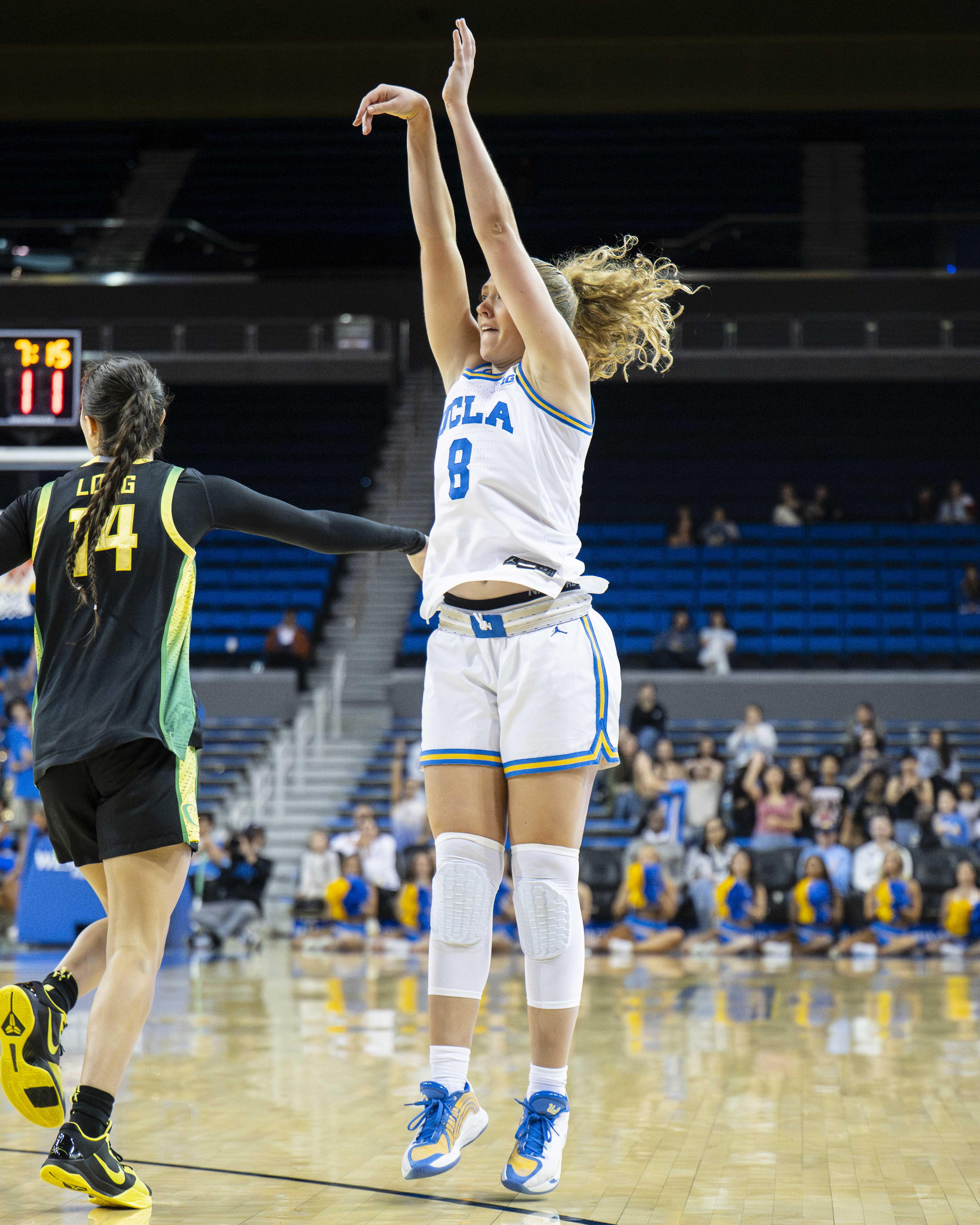 Meanwhile, the Bruins were powered by senior center Lauren Betts’ ninth double-double off 16 points, a season-high-tying 16 rebounds and five assists. Senior guard Kiki Rice, senior forward Gabriela Jaquez and graduate student forward Gianna Kneepkens got in on the offensive effort, too – racking up 20, 13 and 12 points, respectively, to round out UCLA’s double-digit scorers.