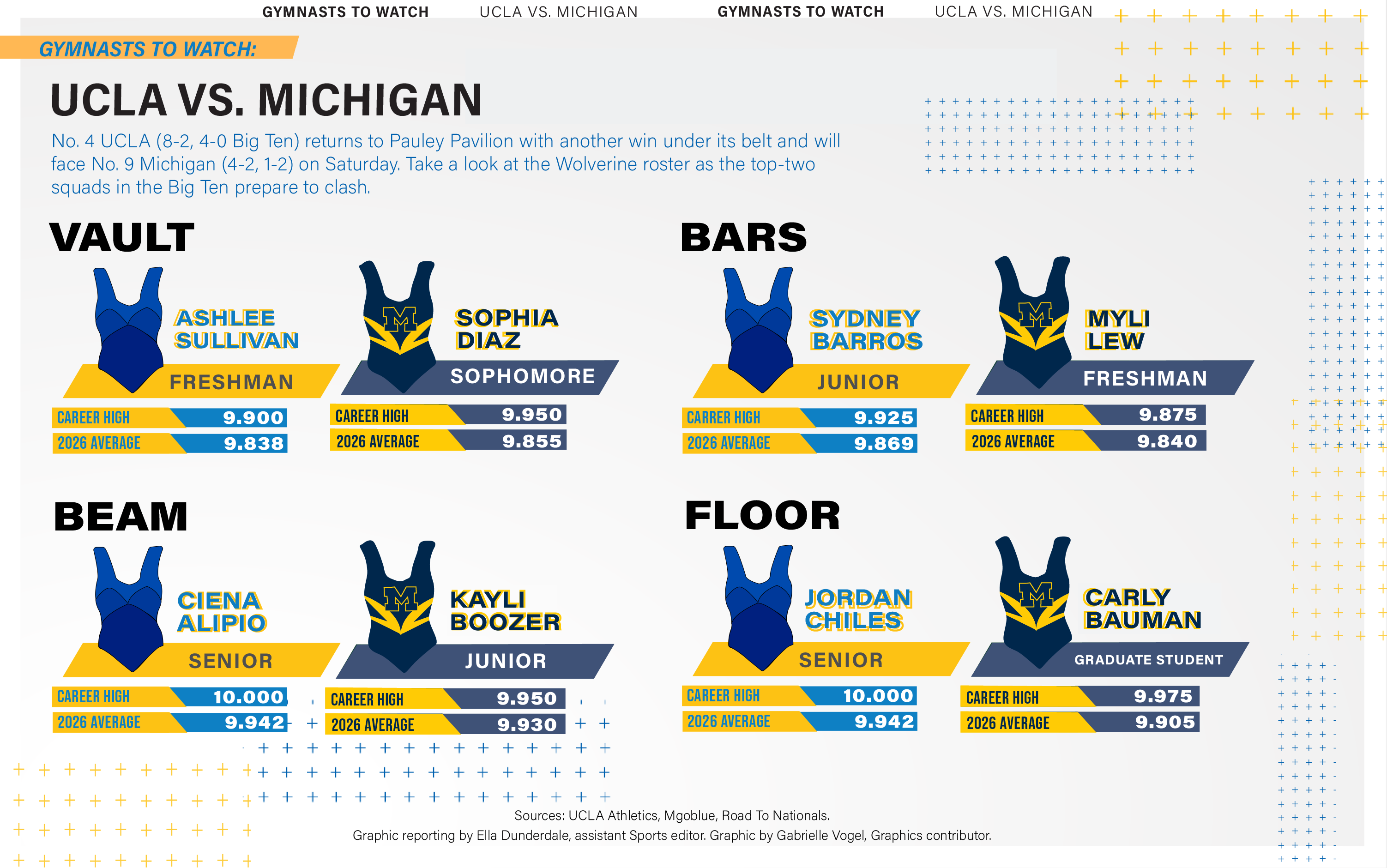 No. 4 UCLA gymnastics will face No. 9 Michigan on Saturday in a top-ranked Big Ten matchup. Daily Bruin contributor Kate Bergfeld analyzes the Wolverine squad ahead of the clash.
