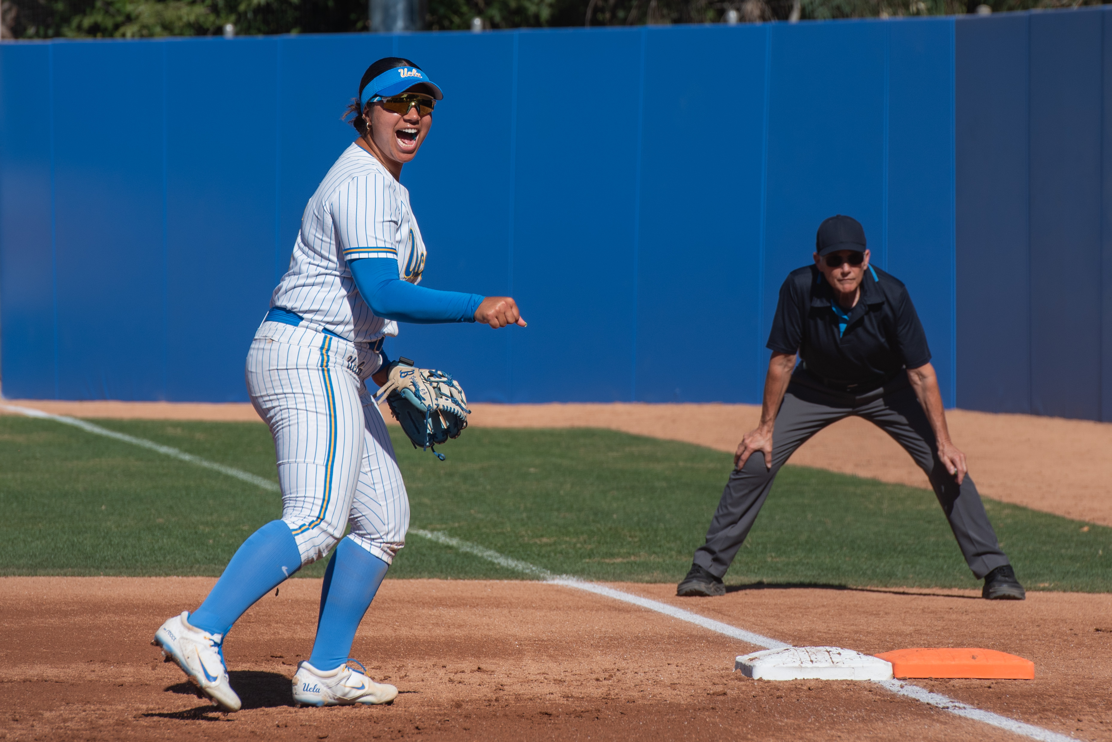 Senior infielder Jordan Woolery yells next to first base after her team recorded an out. Woolery was named Big Ten Player of the Week and NFCA National Player of the Week for her opening-weekend performances. (Brianna Carlson/Daily Bruin staff)