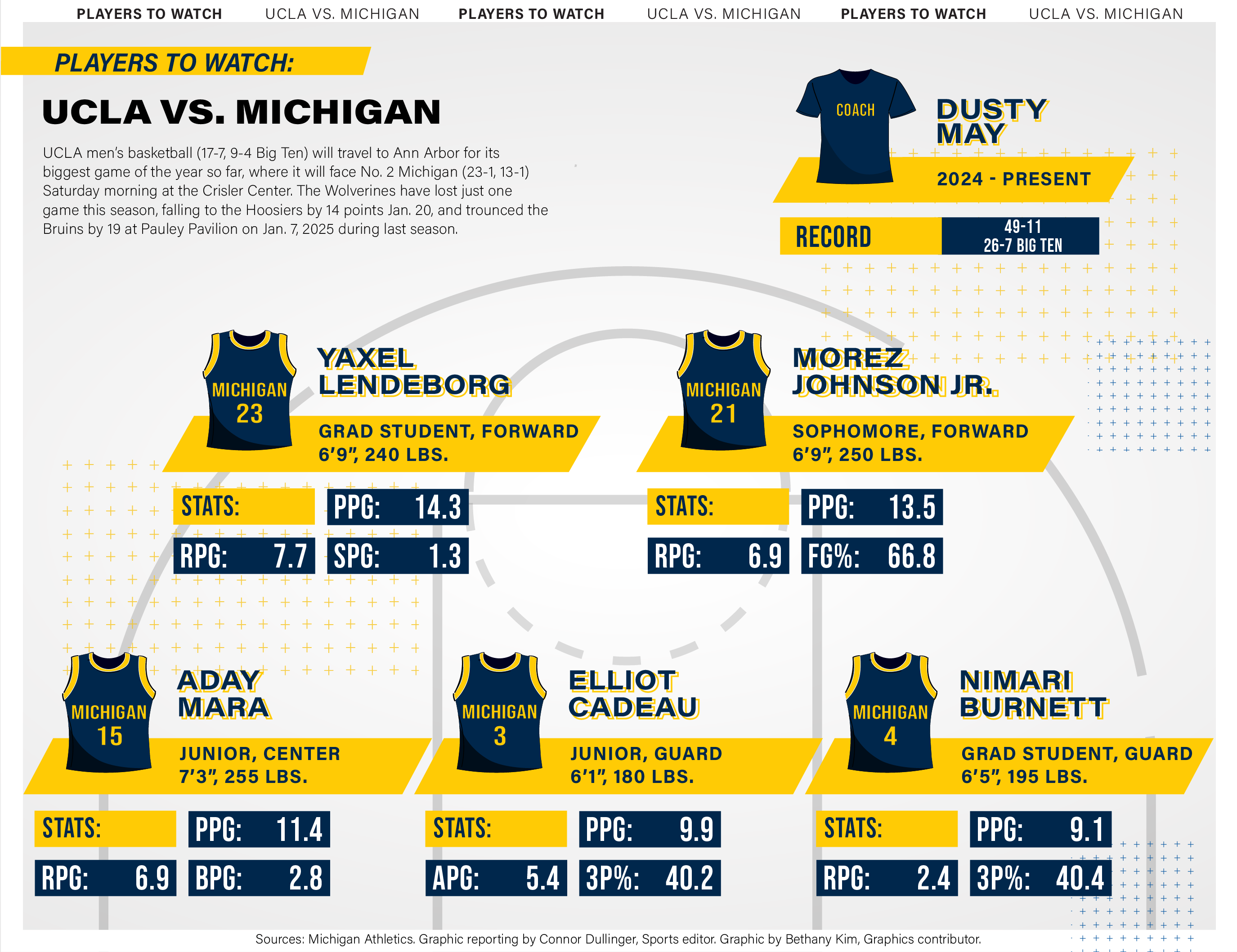 The Bruins are riding a two-game win streak heading into their Michigan road trip, where they will face two top-10 opponents. UCLA men’s basketball (17-7, 9-4 Big Ten) will begin its trip to the Mitten State against No. 2 Michigan (23-1, 13-1) Saturday morning in Ann Arbor at the Crisler Center. Daily Bruin Sports editor Connor Dullinger analyzes the Wolverines’ roster, along with their strengths and weaknesses.