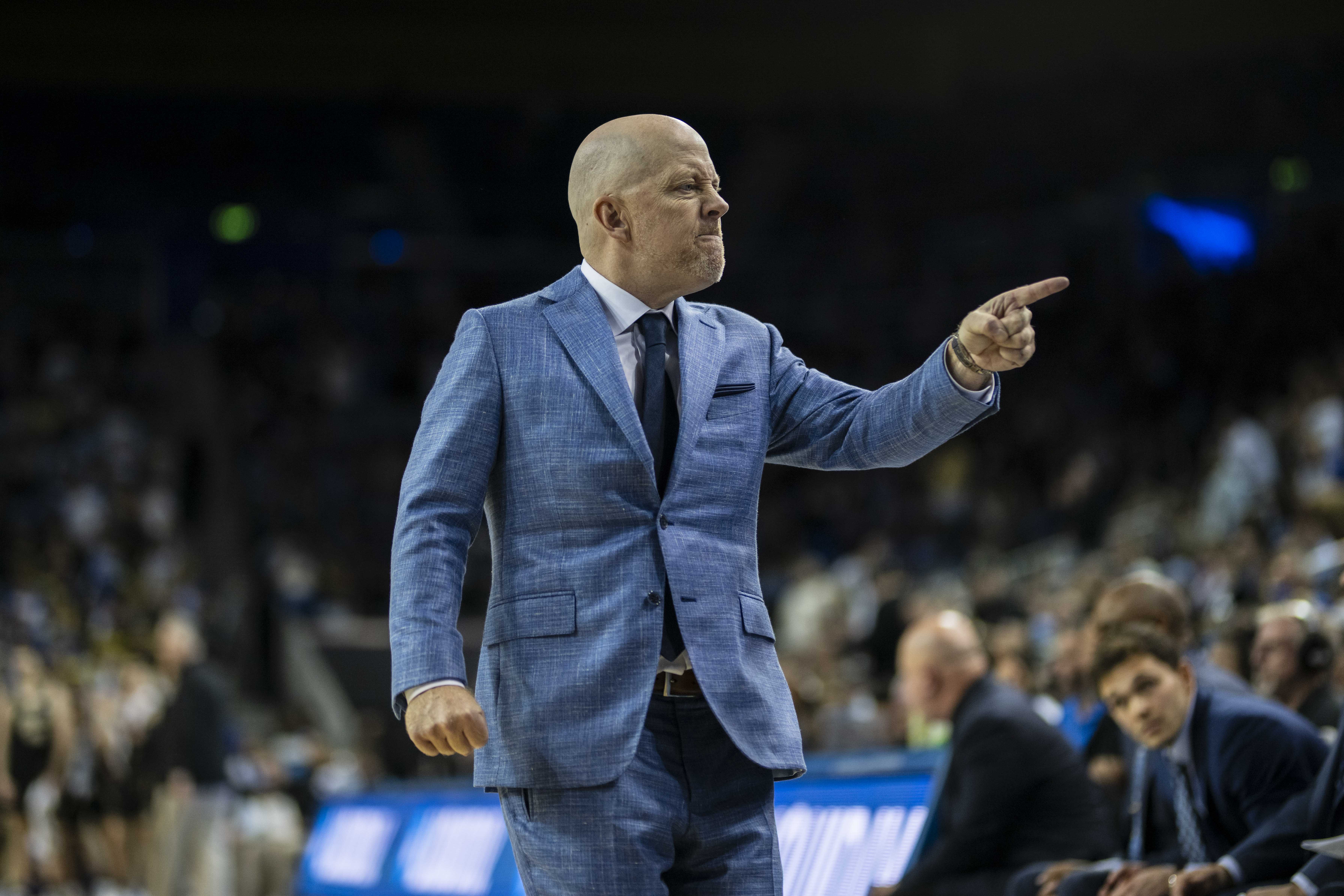 UCLA men’s basketball coach Mick Cronin points his finger as he walks on the sideline at Pauley Pavilion. (Aidan Sun/Assistant Photo editor)