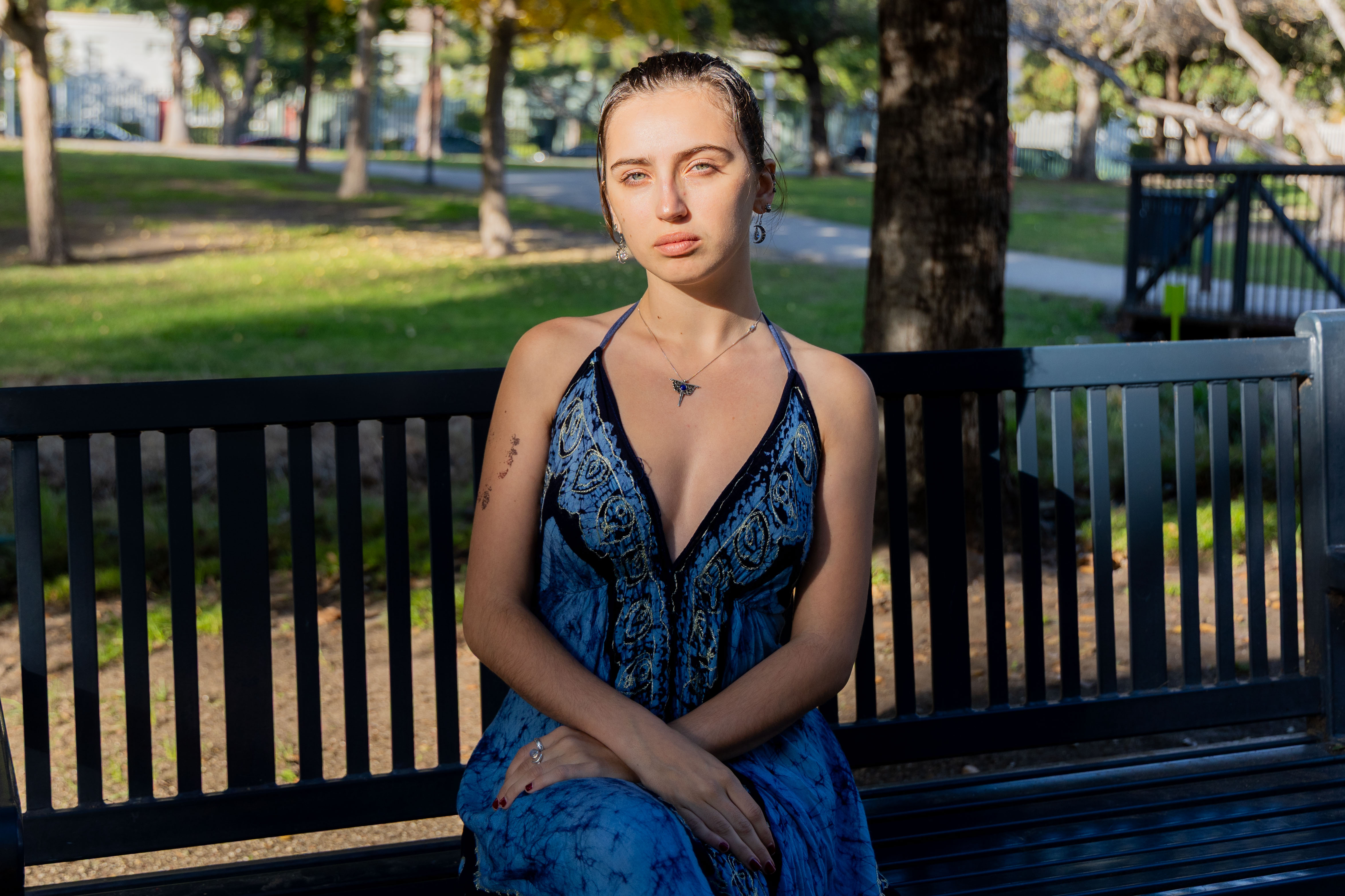 Pictured is UCLA alumnus Dakota Dry, sitting down on a bench while wearing a blue dress. Dry released her debut album, “The Edge of Our Never Ending Universe,” in November 2025. (Chenrui Zhang/Daily Bruin)