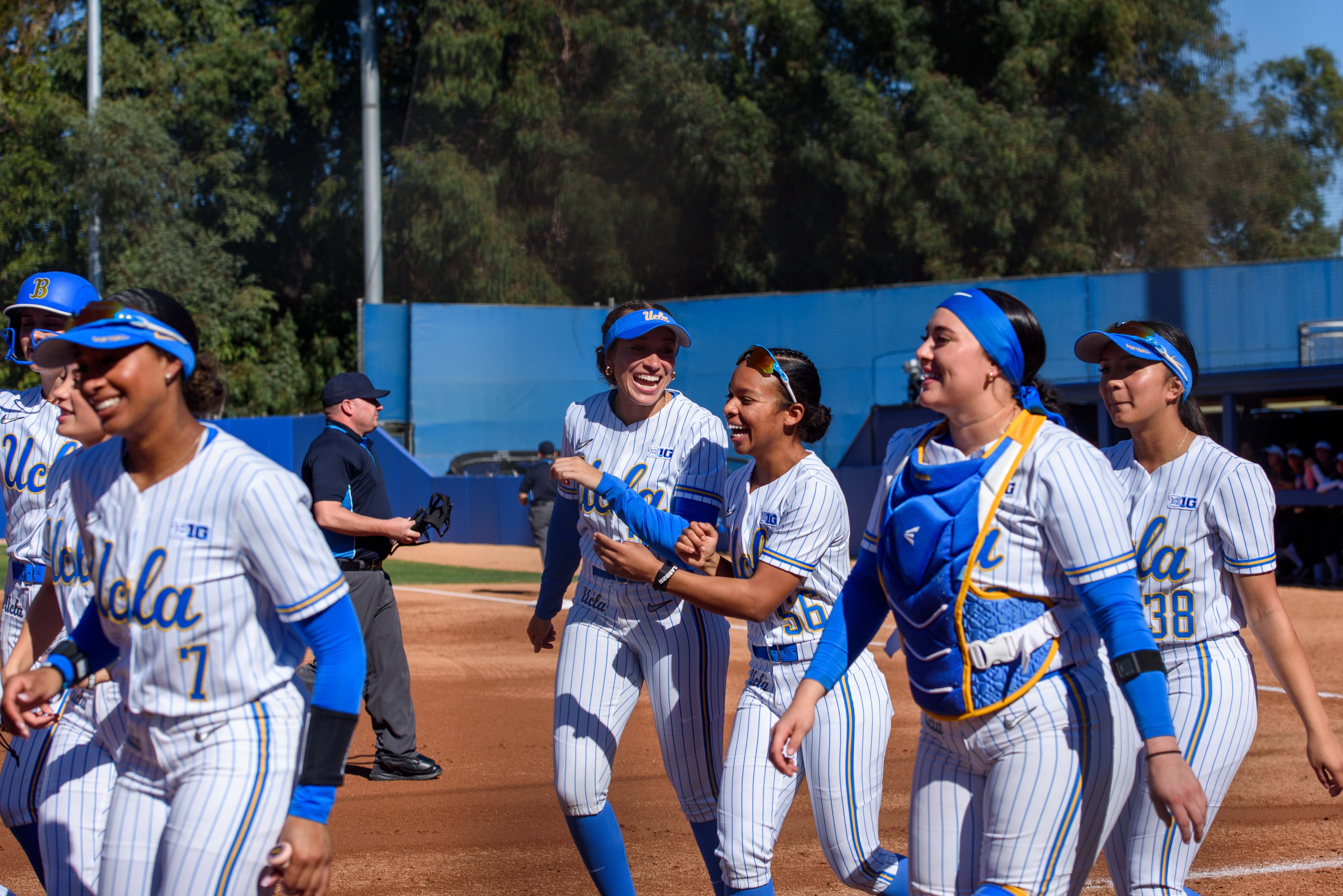 UCLA softball walks off the diamond, smiling and laughing after a victory. The Bruins have won seven of their first 10 games but have gone 1-3 in their ranked matchups thus far. (Bettina Wu/Daily Bruin senior staff)