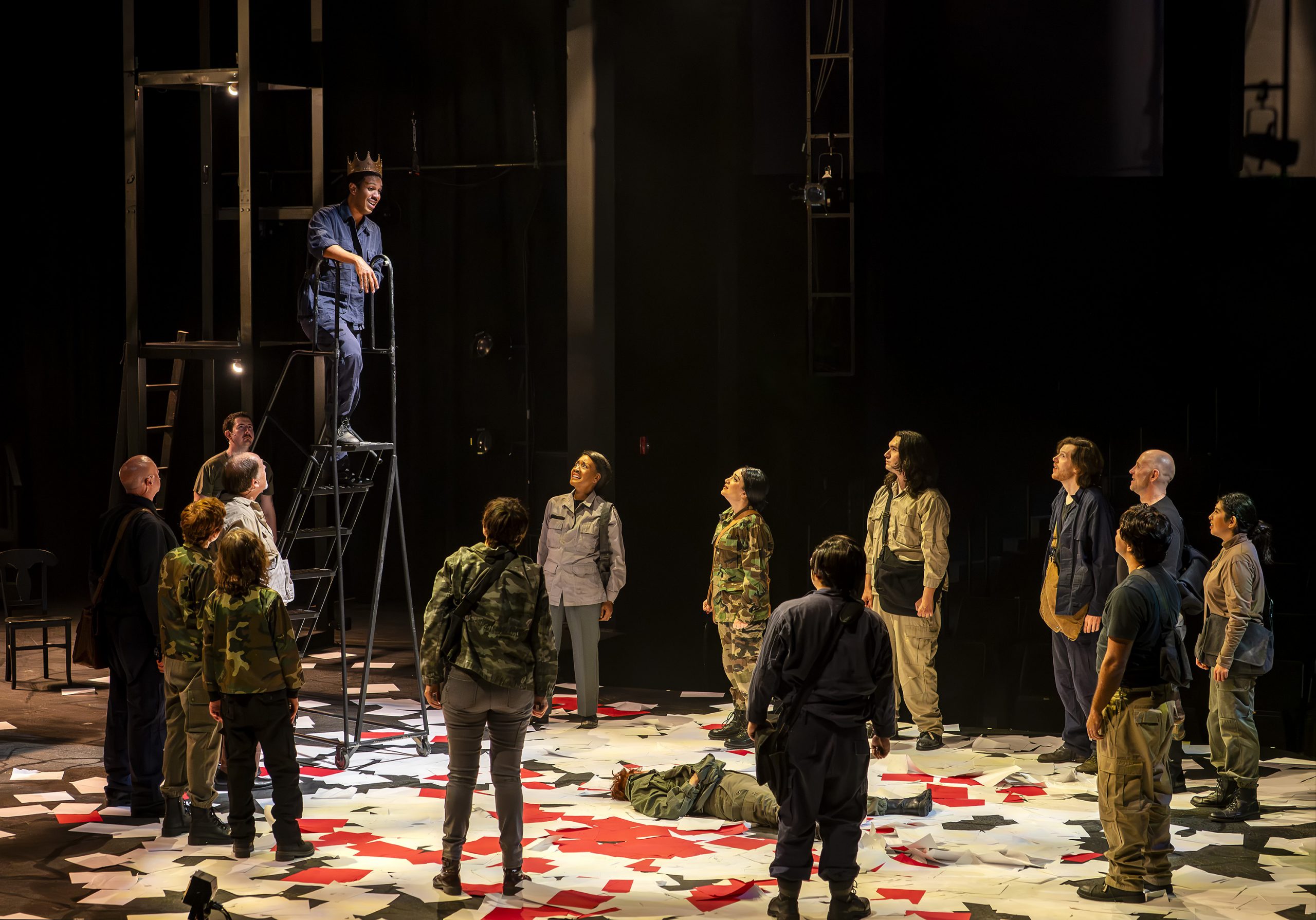 The ensemble of “Richard III” gathers in a circle and gazes up at an individual in a crown standing on a ladder. A Noise Within in Pasadena is presenting an adaptation of William Shakespeare’s play through March 8. (Courtesy of Craig Schwartz)