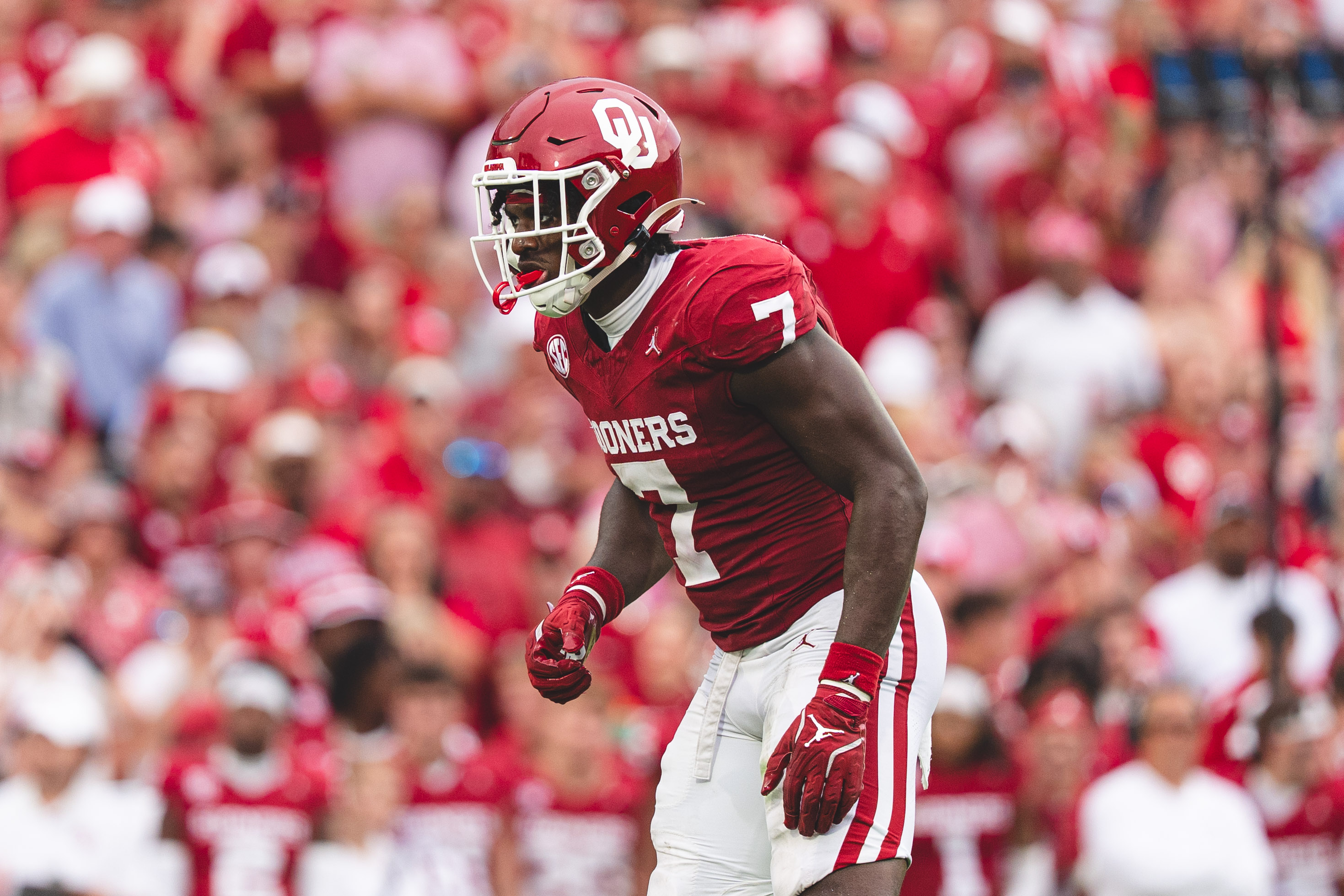 Former Oklahoma and current UCLA linebacker Sammy Omosigho stands on the field. (Courtesy of Peyton Martin/University of Oklahoma)