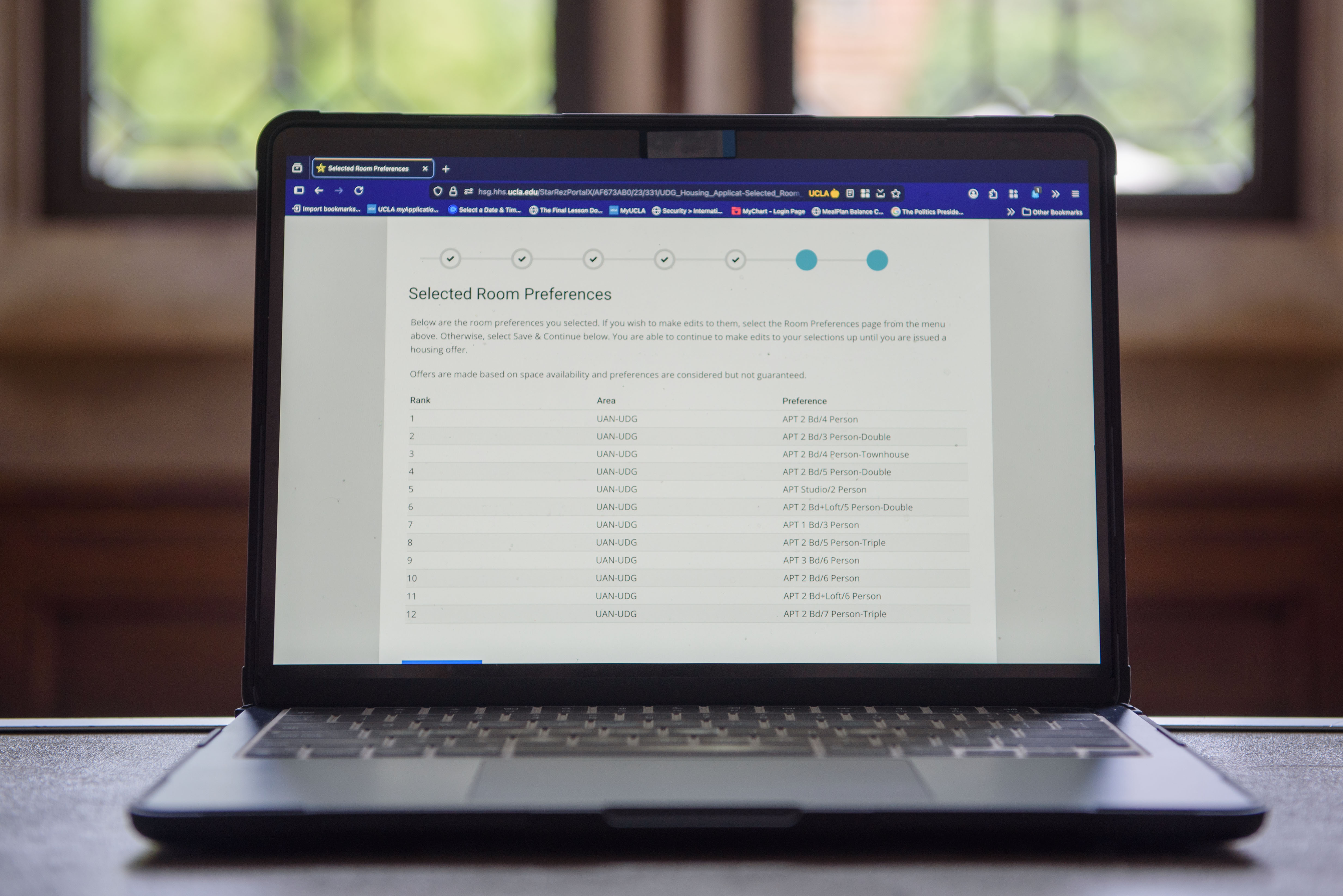 UCLA’s housing application, which was released Jan. 27, is displayed on a laptop. The university is discontinuing 10-person apartments for the 2026-27 academic year. (Joshua Neira/Daily Bruin)