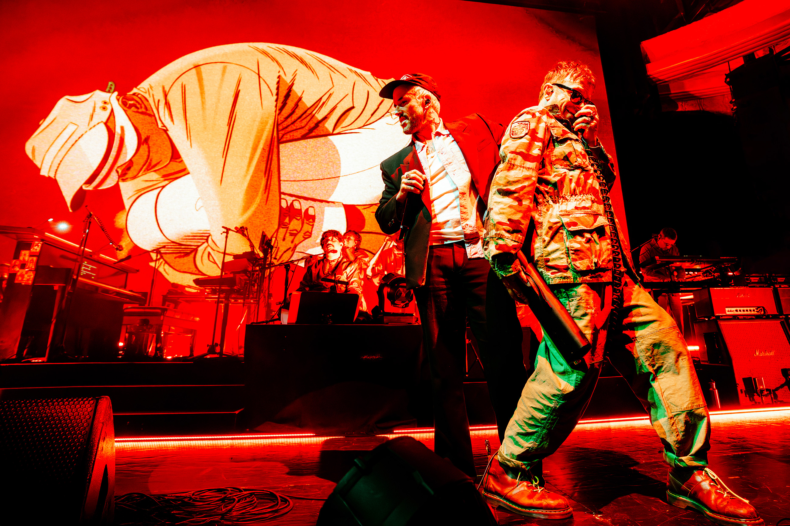 Pictured are Damon Albarn and IDLES member Joe Talbot against an image of Russel Hobbs. The two performed the single “The God of Lying,” which leans into the band’s earlier sound. (Courtesy of Pooneh Ghana)