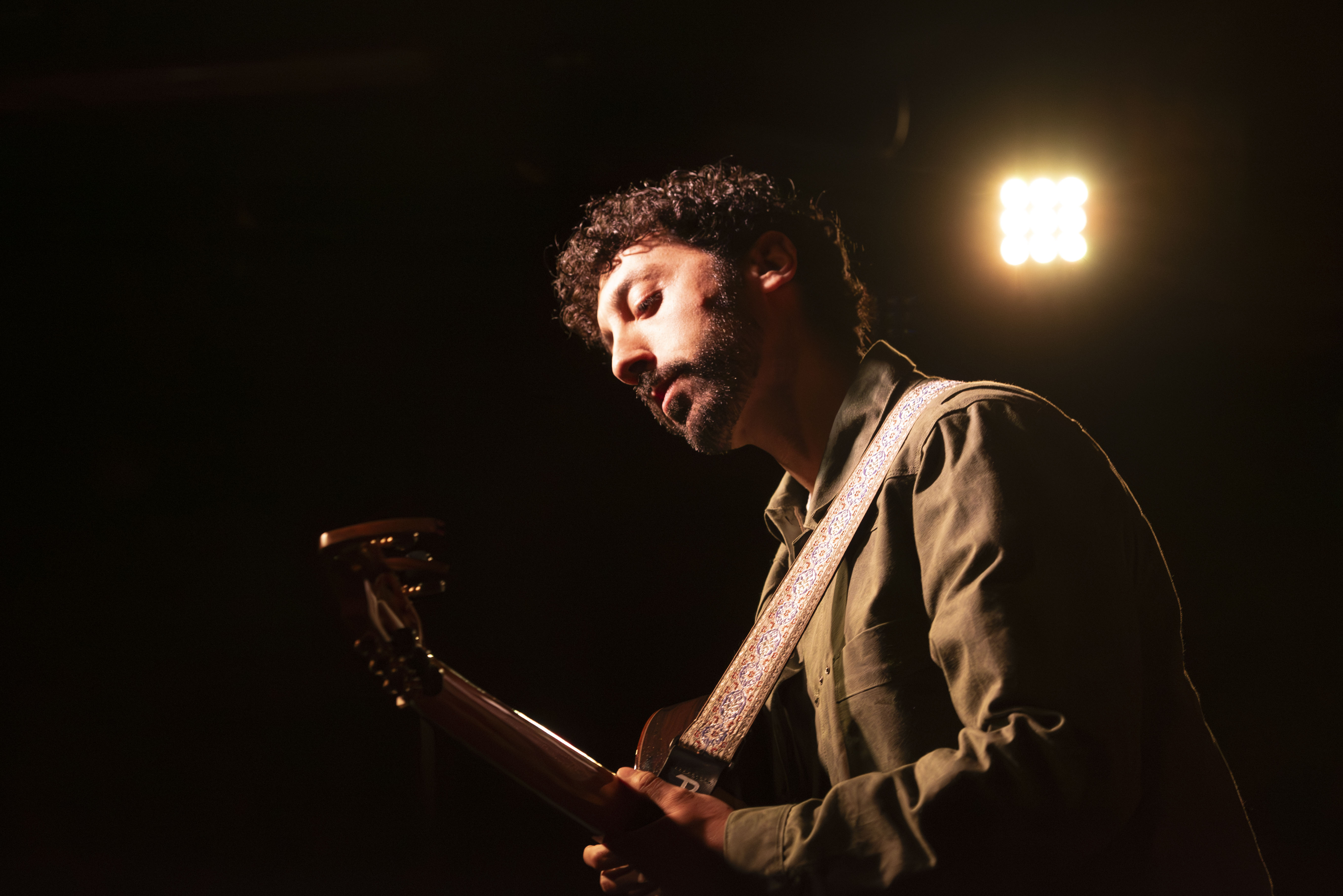 Morgan Jay stands on stage playing a guitar. On Saturday, the comedian headlined a Laughter is the Cure comedy show, a production that planned to donate all proceeds to children residing in UCLA’s Mattel Children’s Hospital. (Karla Cardenas-Felipe/Daily Bruin staff)
