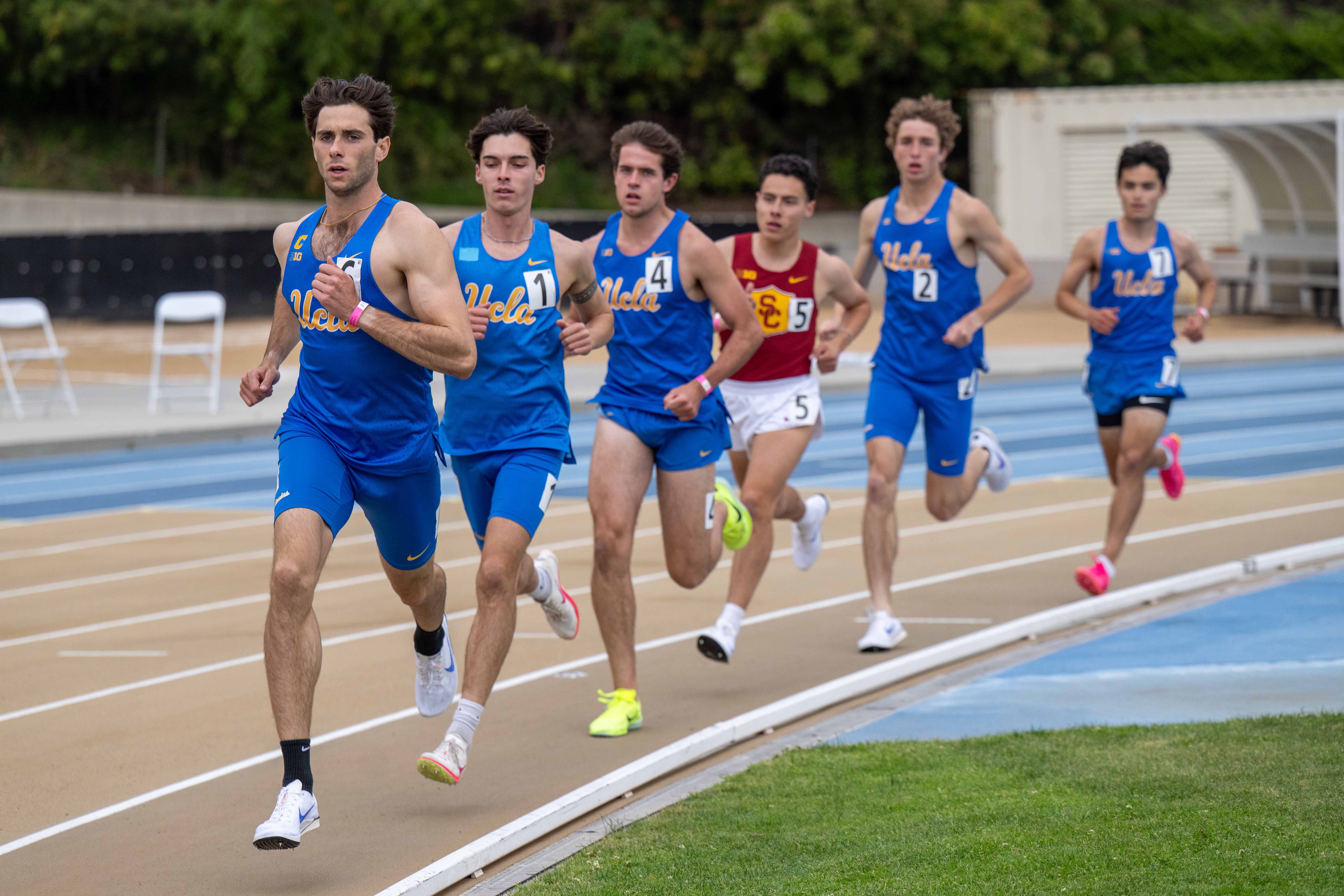 Five Bruin distance athletes run in a line together at last year’s UCLA-USC dual meet May 4. (Edward Ho/Daily Bruin)