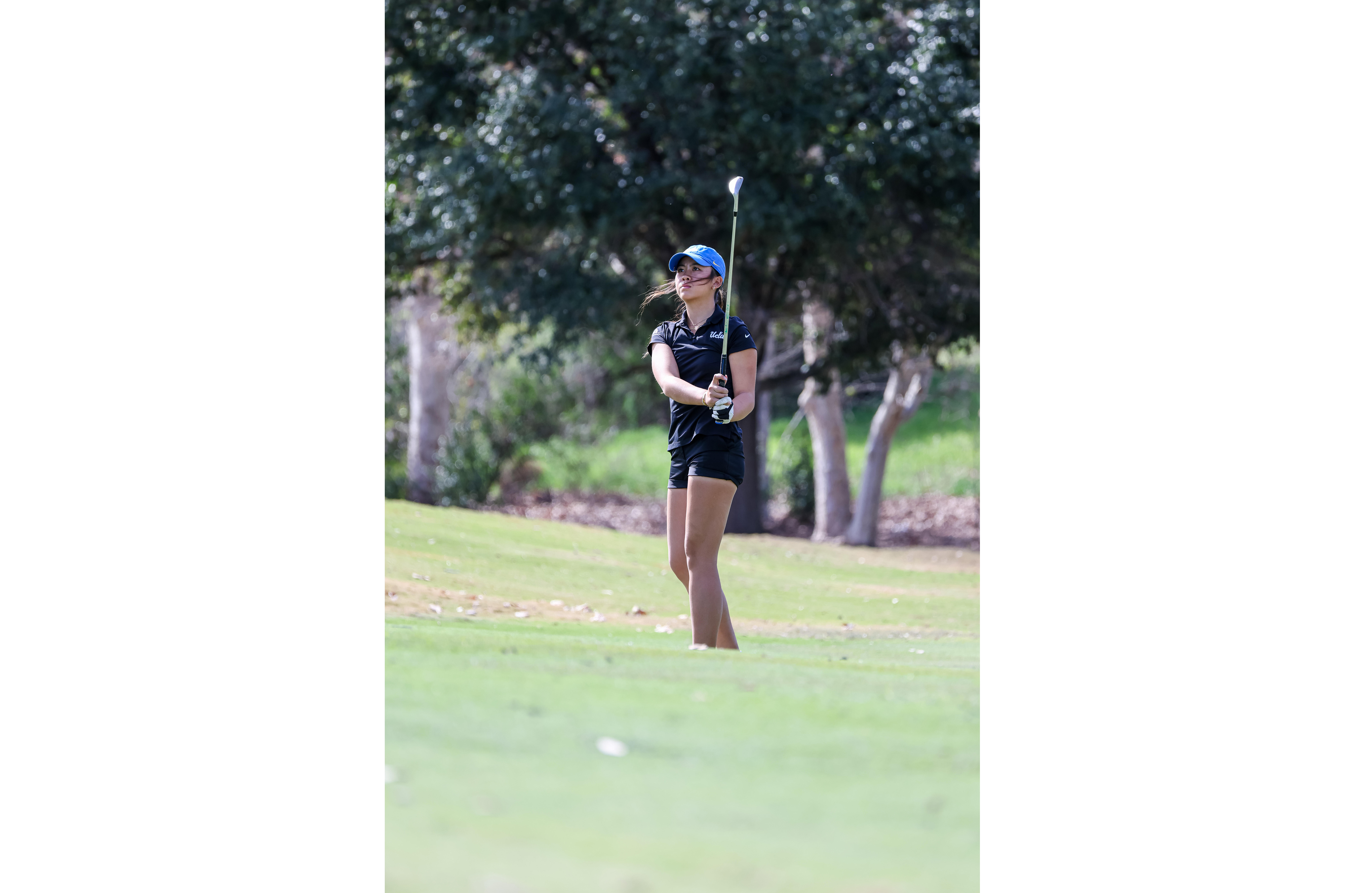 Kacey Ly looks into the distance after a swing. The freshman has earned three consecutive fourth-place finishes this winter, following a fall campaign where she placed between No. 21 and No. 39 at every tournament. (Courtesy of Alicia Helmstetter/UCLA Athletics)