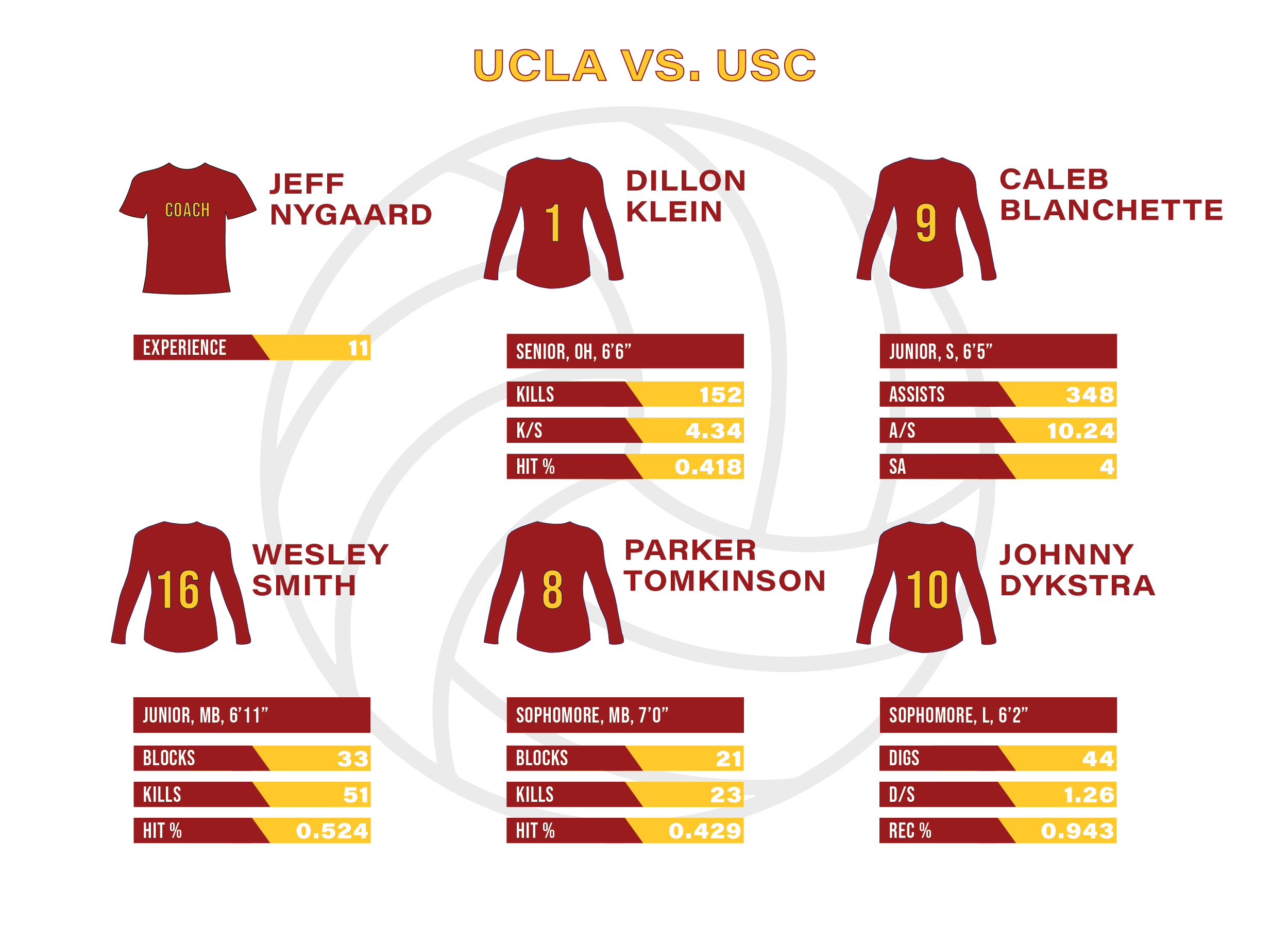 The Bruins may also need to account for USC’s size on the pins and in the middle. The 6-foot-11 Smith and 7-foot Tomkinson – the tallest player in program history – give the Trojans a physical presence at the net, while Klein’s high contact point allows him to score even against well-formed blocks.