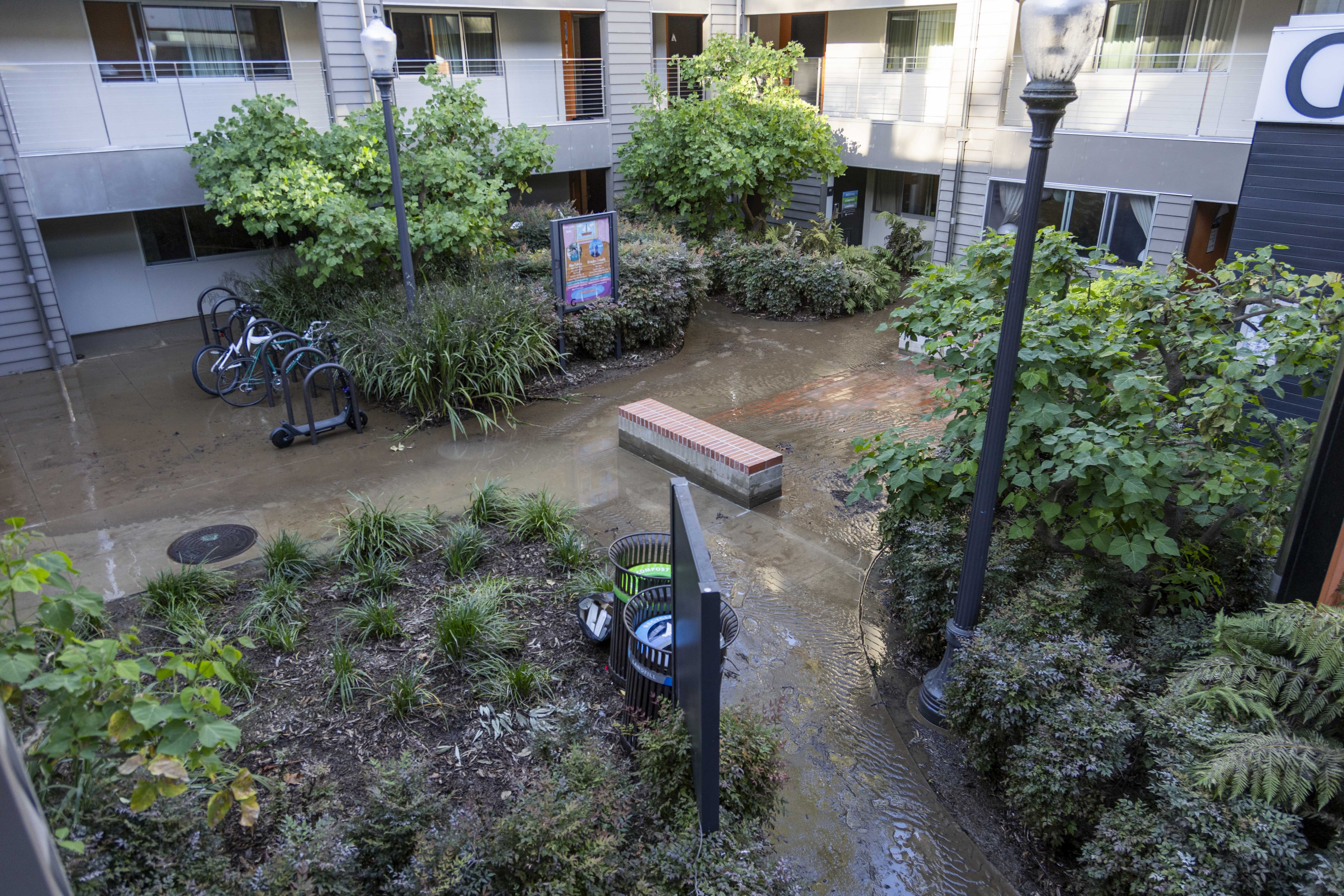 Murky water rushed down De Neve Drive as students walked up and down the Hill on Tuesday afternoon. Ella Ryley Fortich, a resident on Saxon’s second floor, said dirt and grass surrounding Saxon’s walkways turned to mud because of the flooding.