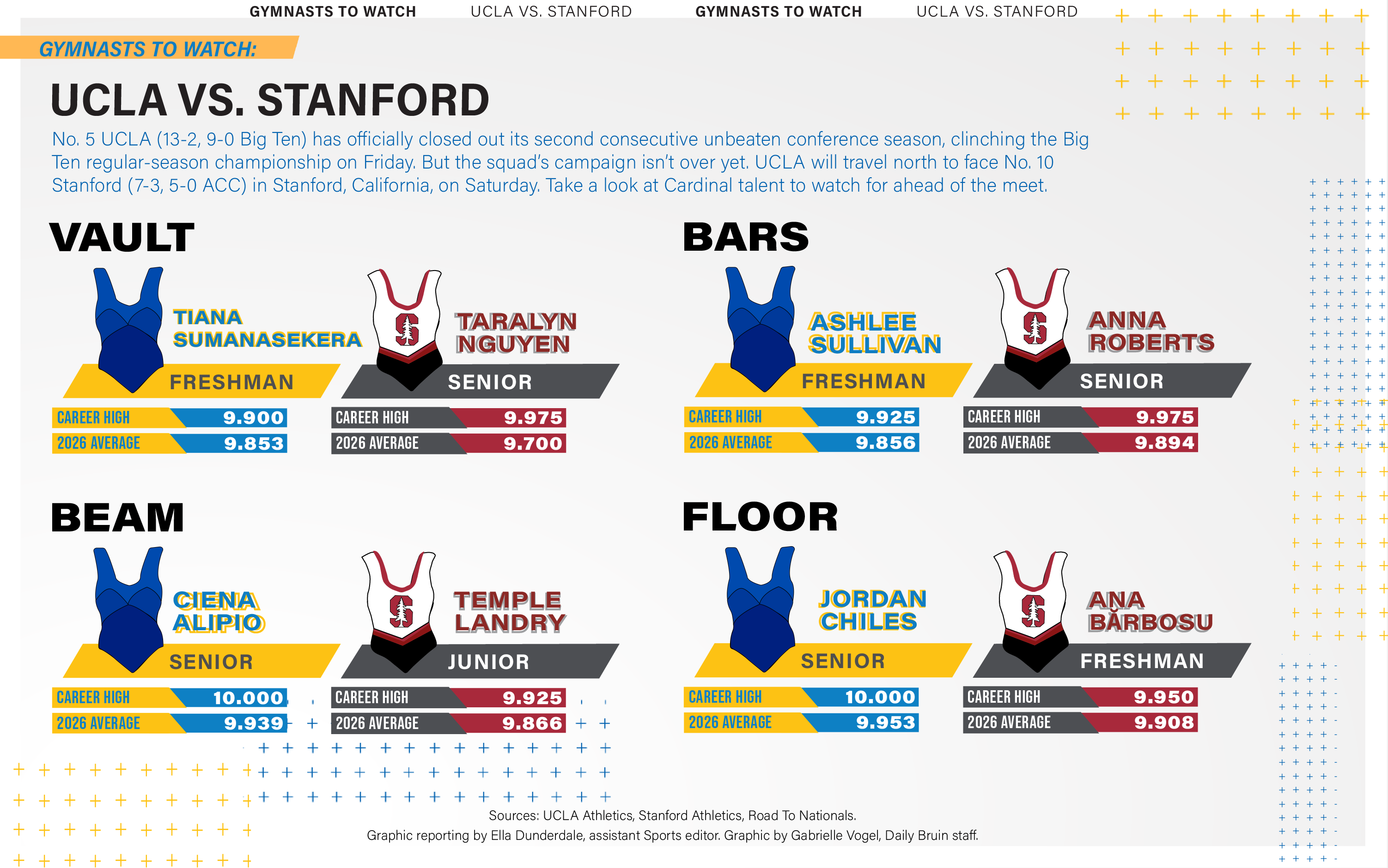 No. 5 UCLA gymnastics (13-2, 9-0 Big Ten) will face old Pac-12 foe No. 10 Stanford (7-3, 5-0 ACC) on Saturday in a clash of postseason contenders in Stanford, California. The Bruins are coming off a victory at the Big Four quad in which they clinched the Big Ten regular-season title. But the Cardinal had a historic week of their own, breaking the 198.000 barrier for the first time since 2004 and second time in program history. Daily Bruin contributor Sofia Celis analyzes the Cardinal roster ahead of the matchup.