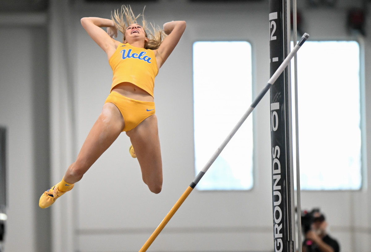 Graduate student pole vaulter Paige Sommers falls after completing her vault. The Westlake Village, California, local transferred from Duke ahead of the 2026 campaign. Her younger brother, sophomore pole vaulter Cade Sommers, also competes for the Bruins. (Courtesy of Bobby Goddin)