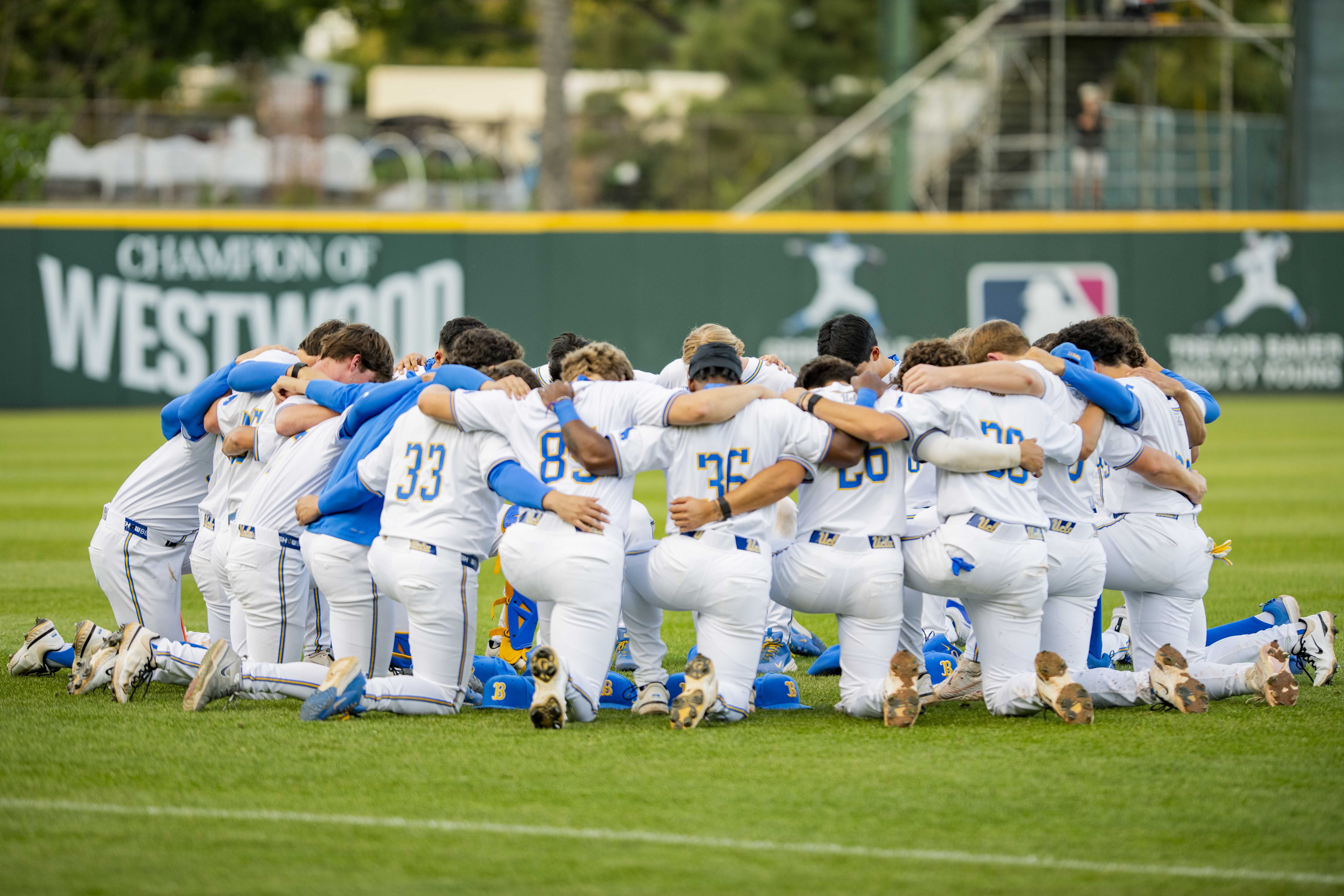 UCLA baseball kneels in a circle before the start of a game. (Vanessa Man/Daily Bruin)