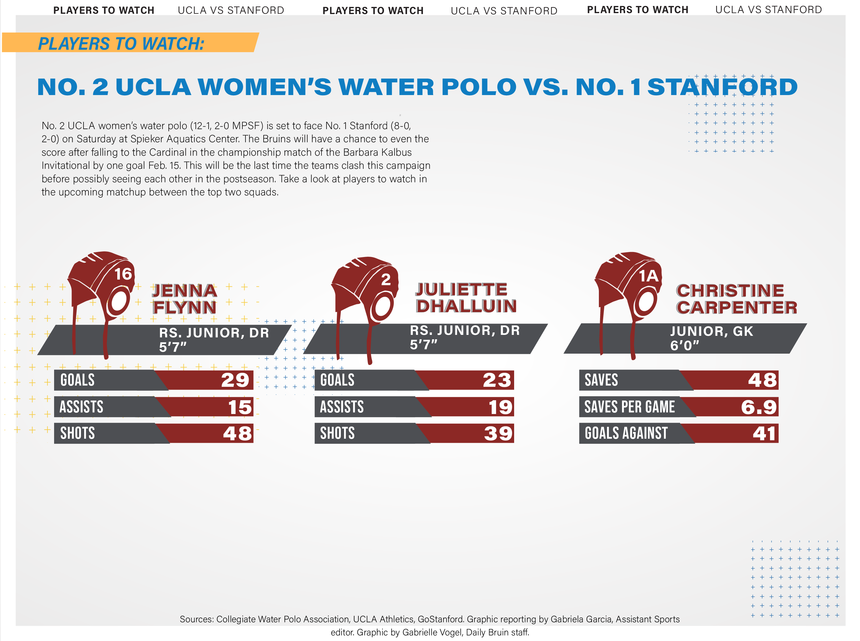 No. 2 UCLA women’s water polo (12-1, 2-0 MPSF) will host No. 1 Stanford (8-0, 2-0) Saturday to continue a nine-game stretch at Spieker Aquatics Center in March. The Bruins fell to the reigning national champions by one score Feb. 15 and now have the opportunity to even the board. Daily Bruin assistant sports editor Gabriela Garcia analyzes the Cardinal roster ahead of the upcoming match.