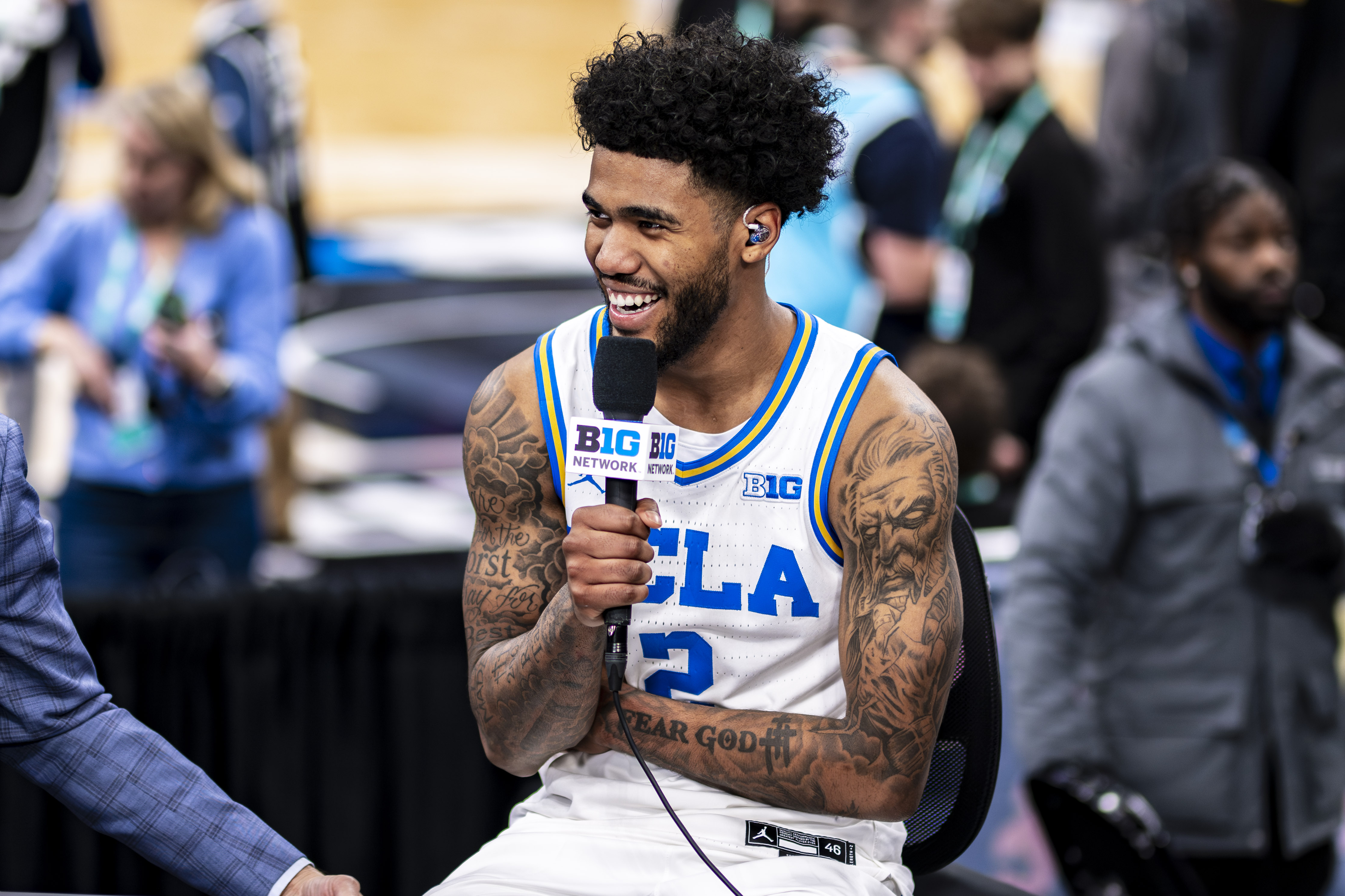 Senior guard Donovan Dent smiles and talks to broadcasters in the post-game press conference. Dent garnered UCLA’s first triple-double since 2013 and the first-ever triple-double in the Big Ten tournament. (Aidan Sun/Assistant Photo editor)