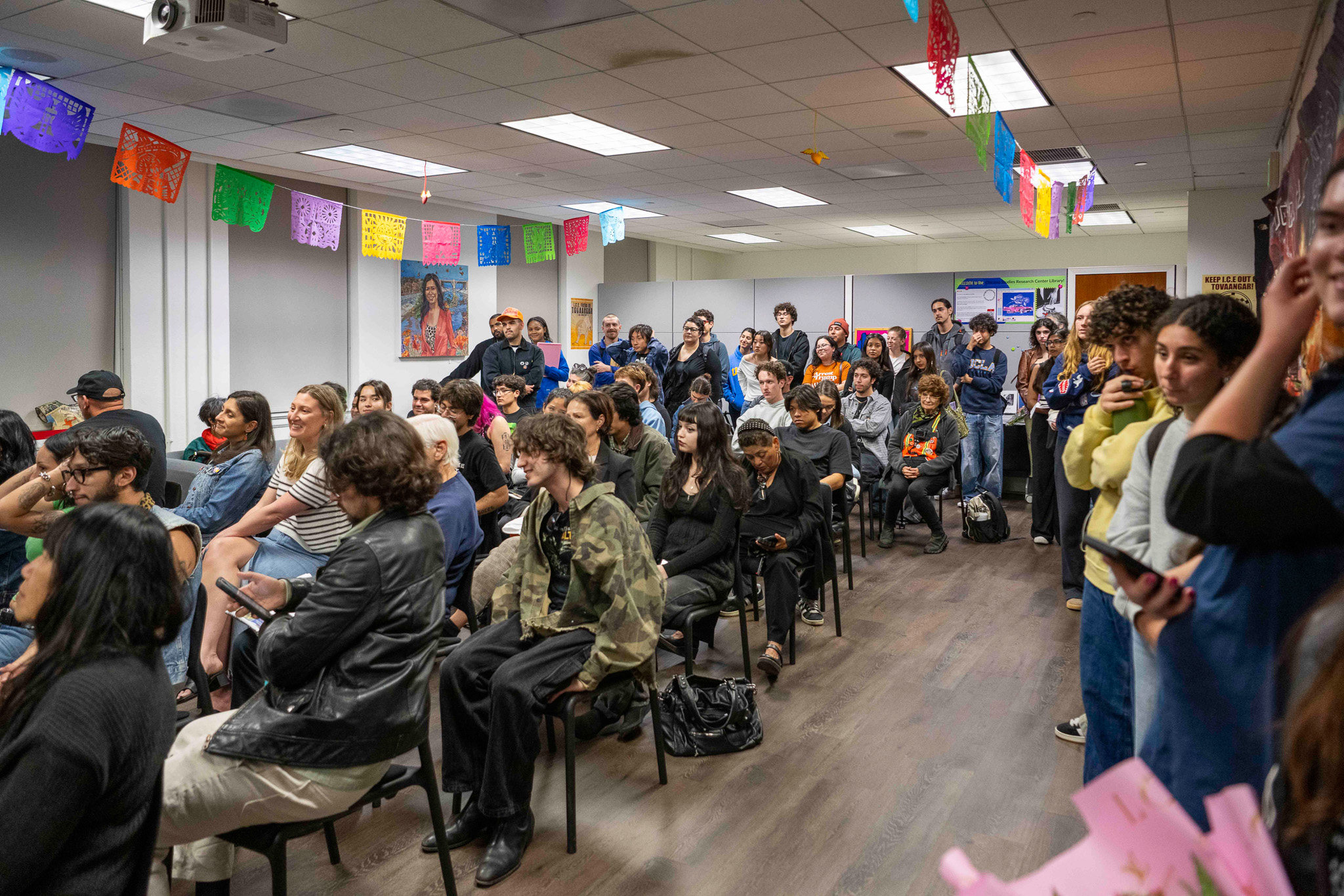 Attendees of the “ICE OUT: Arte en Resistencia” exhibit listen to a discussion panel. On Tuesday, the Chicano Studies Research Library hosted the opening night for the art exhibit. (Pranav Akella/Daily Bruin)