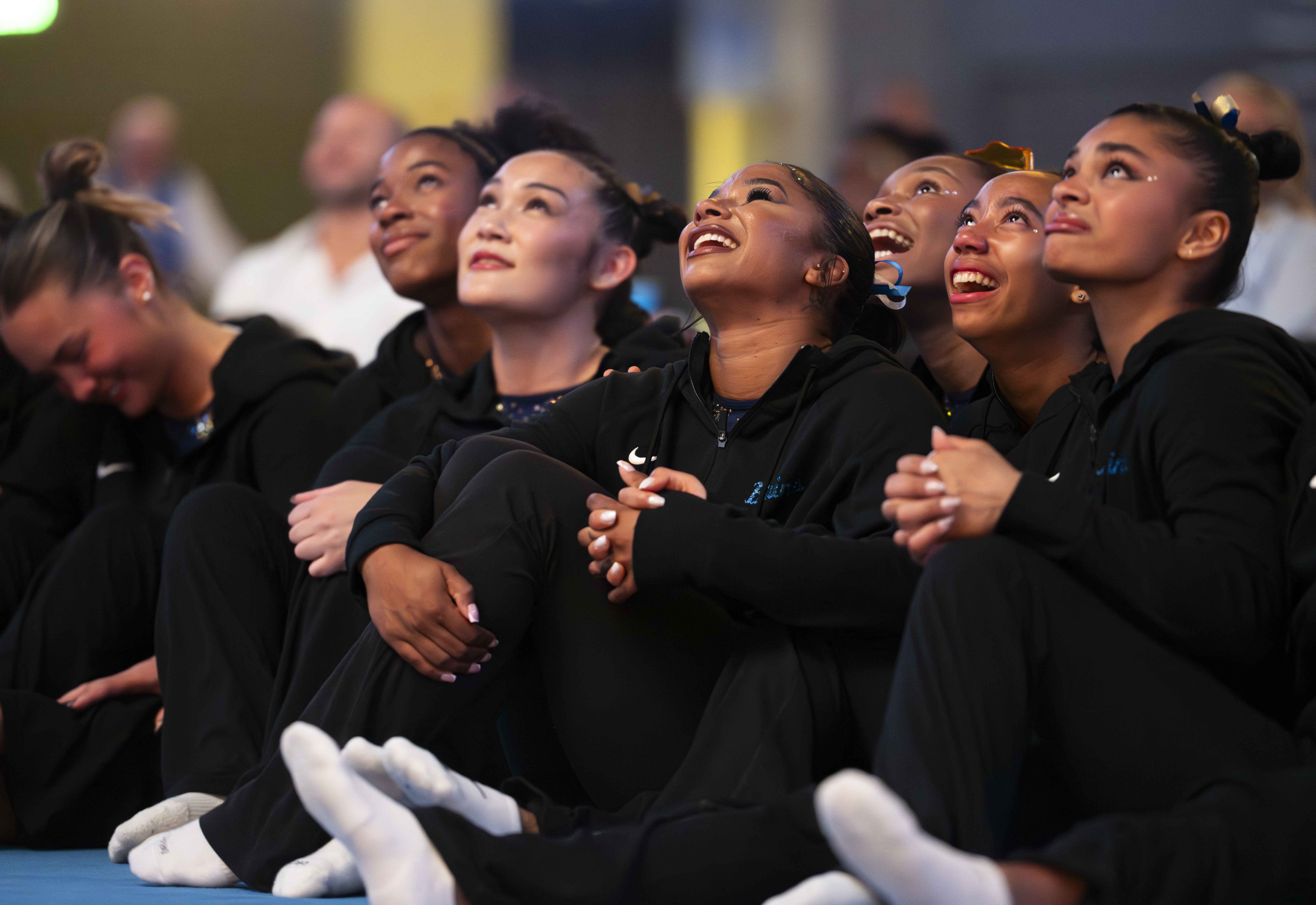 Members of UCLA gymnastics sit together and watch the senior night video. The Bruins notched a 197.850 Saturday night, marking their second-highest tally this season. (Zimo Li/Daily Bruin senior staff)