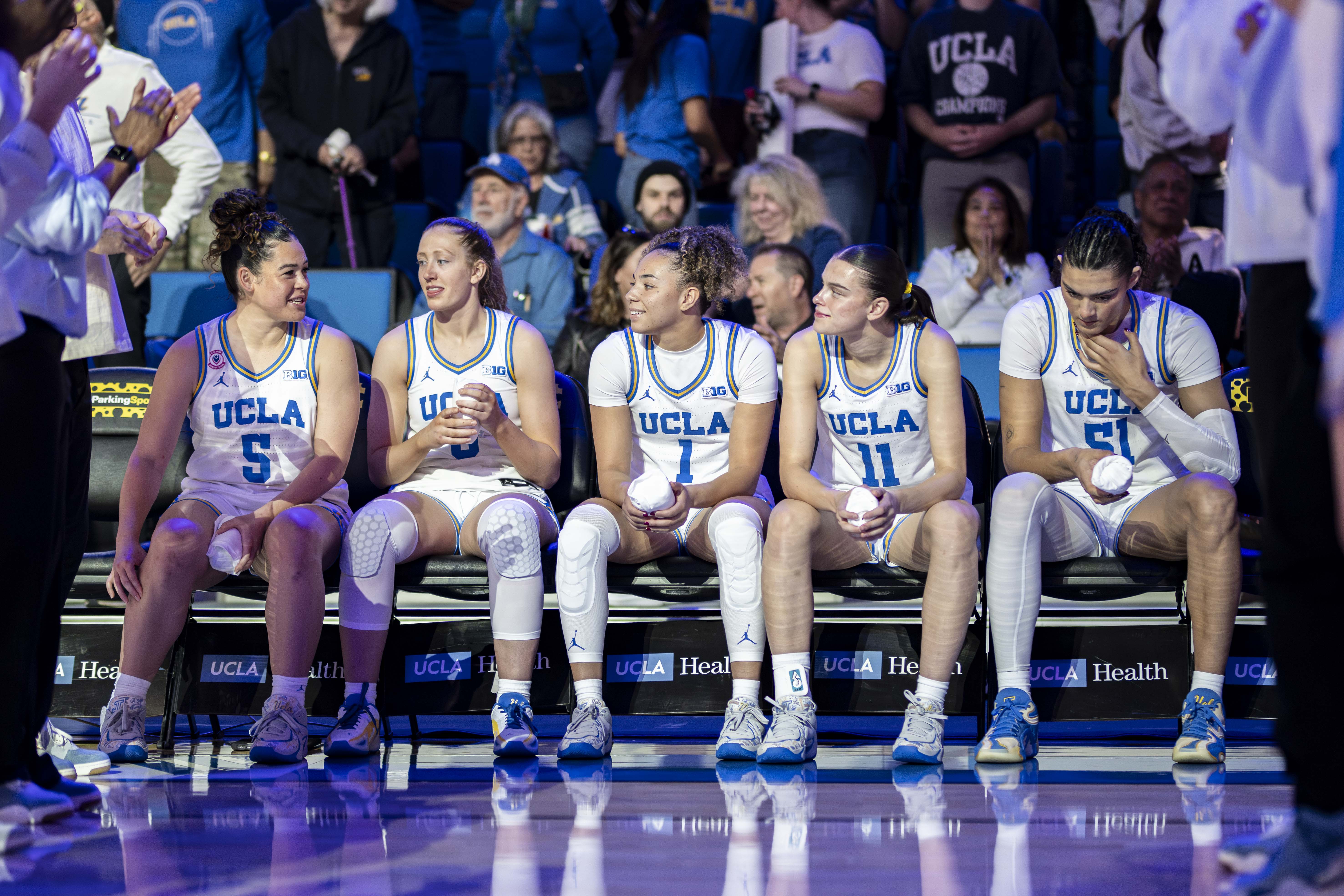 UCLA women’s basketball’s starting five sits on the bench while they wait for the opening lineups to be announced during a home game at Pauley Pavilion. (Aidan Sun/Assistant Photo editor)
